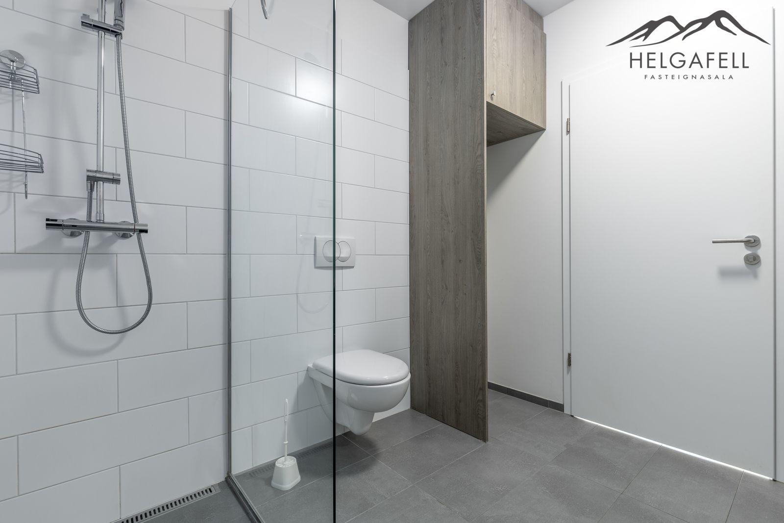 Baðherbergi/þvottaherbergi er með flísum á gólfi, innréttingu, upphengdu salerni, handklæðaofni og "walk-in" sturtu. Tengi og aðstaða fyrir þvottavél og þurrkara. Hiti í gólfi.