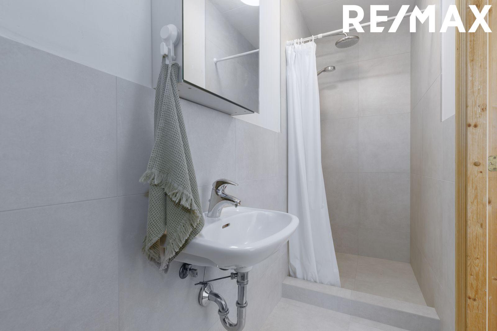Baðherbergi: Flísalagt í hólf og gólf. Sturtuklefi með flísalögn og baðkar. Hvít innrétting með handlaug. Salerni.