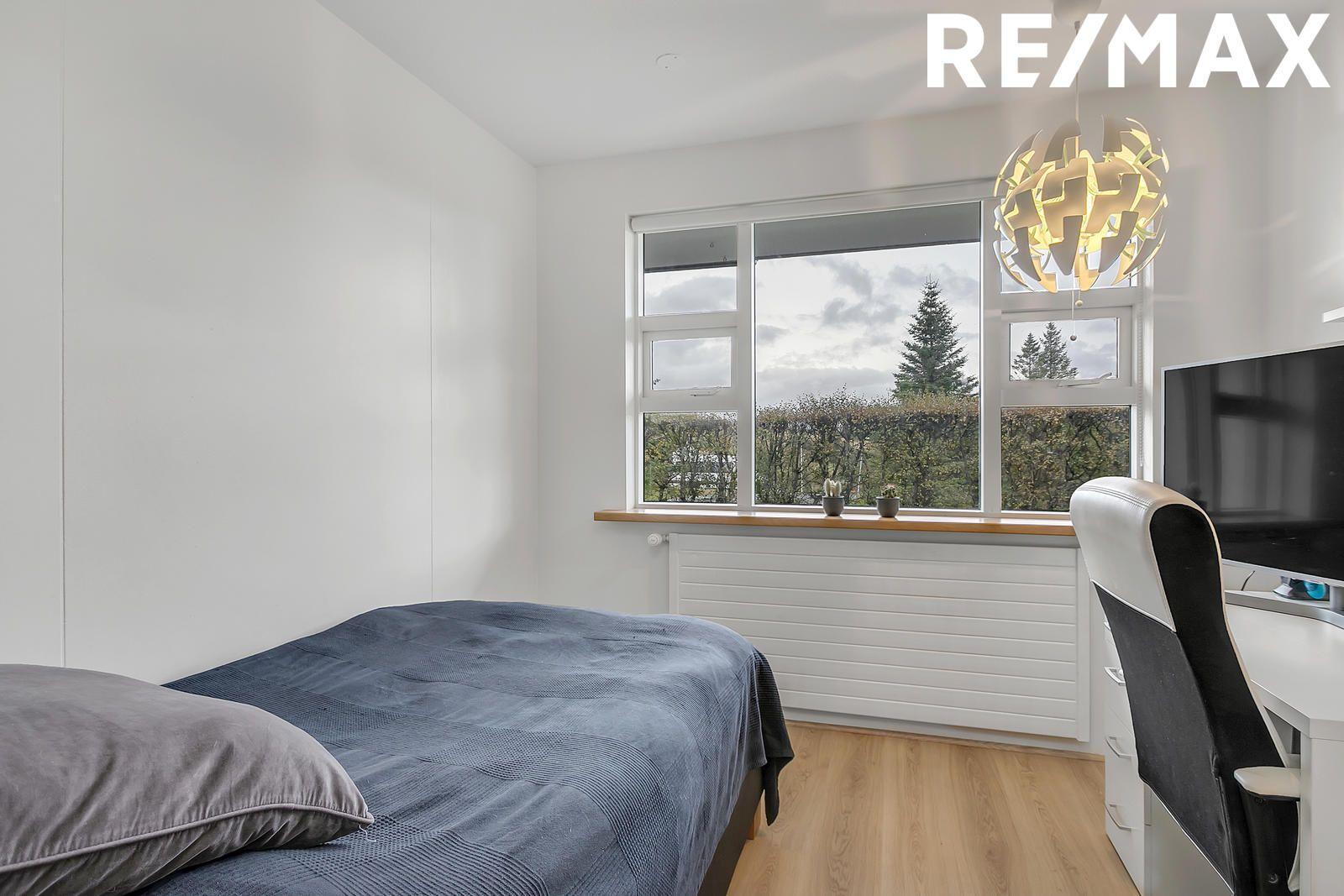 Svefnherbergi: Stórt svefnherbergi með góðum fataskápum. Tvær hurðir inn í herbergið. Útgengt á góðar suðursvalir.