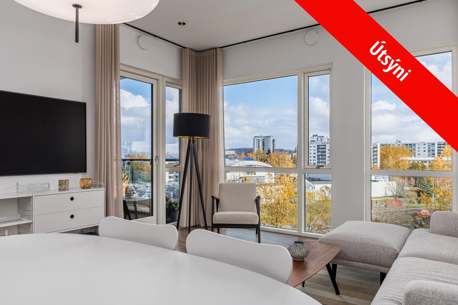 Stofa / borðstofa: Í alrými með eldhúsi, rúmgóð og björt með gólfsíðum gluggum, útgengi út á austur svalir, fallegt útsýni, parket á gólfi.