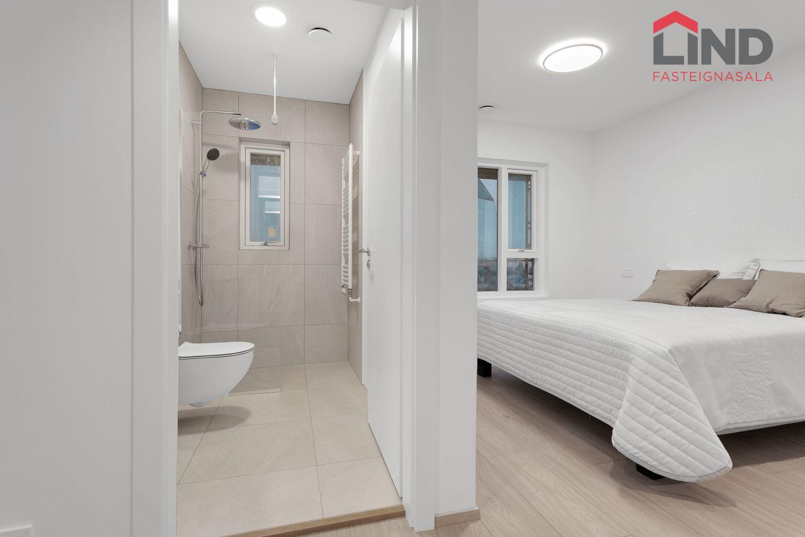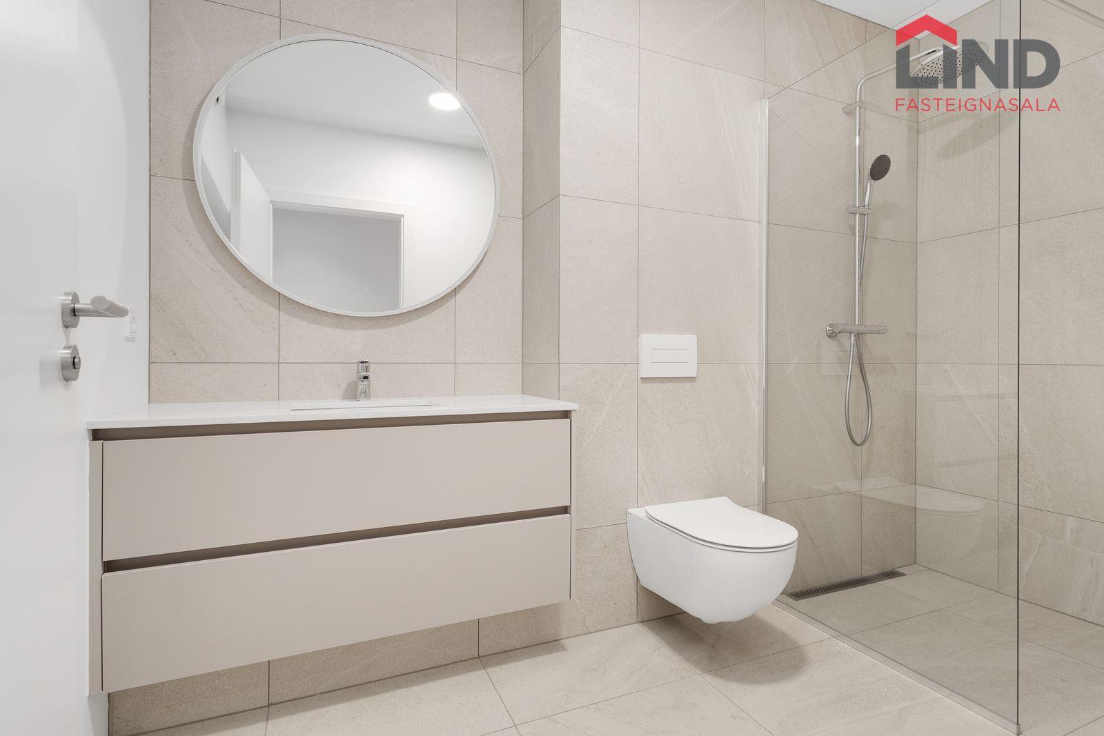 Hreinlætistæki: Salernisskál (Laufen) er vegghengd með innbyggðum vatnskassa. Sturtur eru með flísalögðum botni og hertu sturtugleri. Hreinlætistæki eru hitastýrð frá Damixa. Þvottahús eru ýmist innan baðherbergja eða í sér rými.