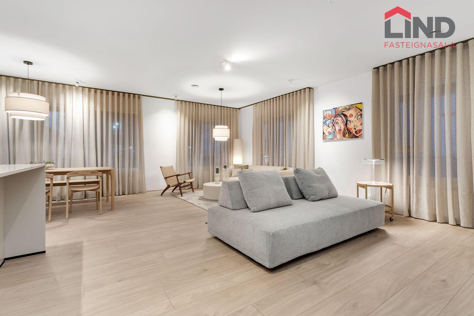 Íbúð 503: Er glæsileg 171,0 fermetra 3ja - 4ra herbergja penthouse íbúð á 5. hæð með stórum 59,4 fermetra þaksvölum til suðurs og tveimur sérmerktum bílastæðum í lokuðum bílakjallara. Tvær góðar geymslur fylgja íbúðinni sem eru 21,7 fermetrar og 10,1 fermetrar að stærð. Afhending er í mars-apríl 2026 með fyrirvara um að öryggisúttekt sé komin á húsið.