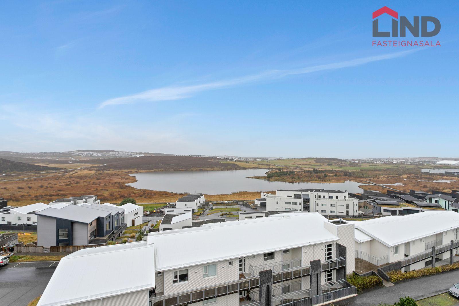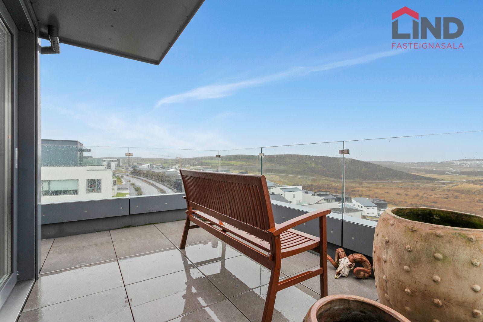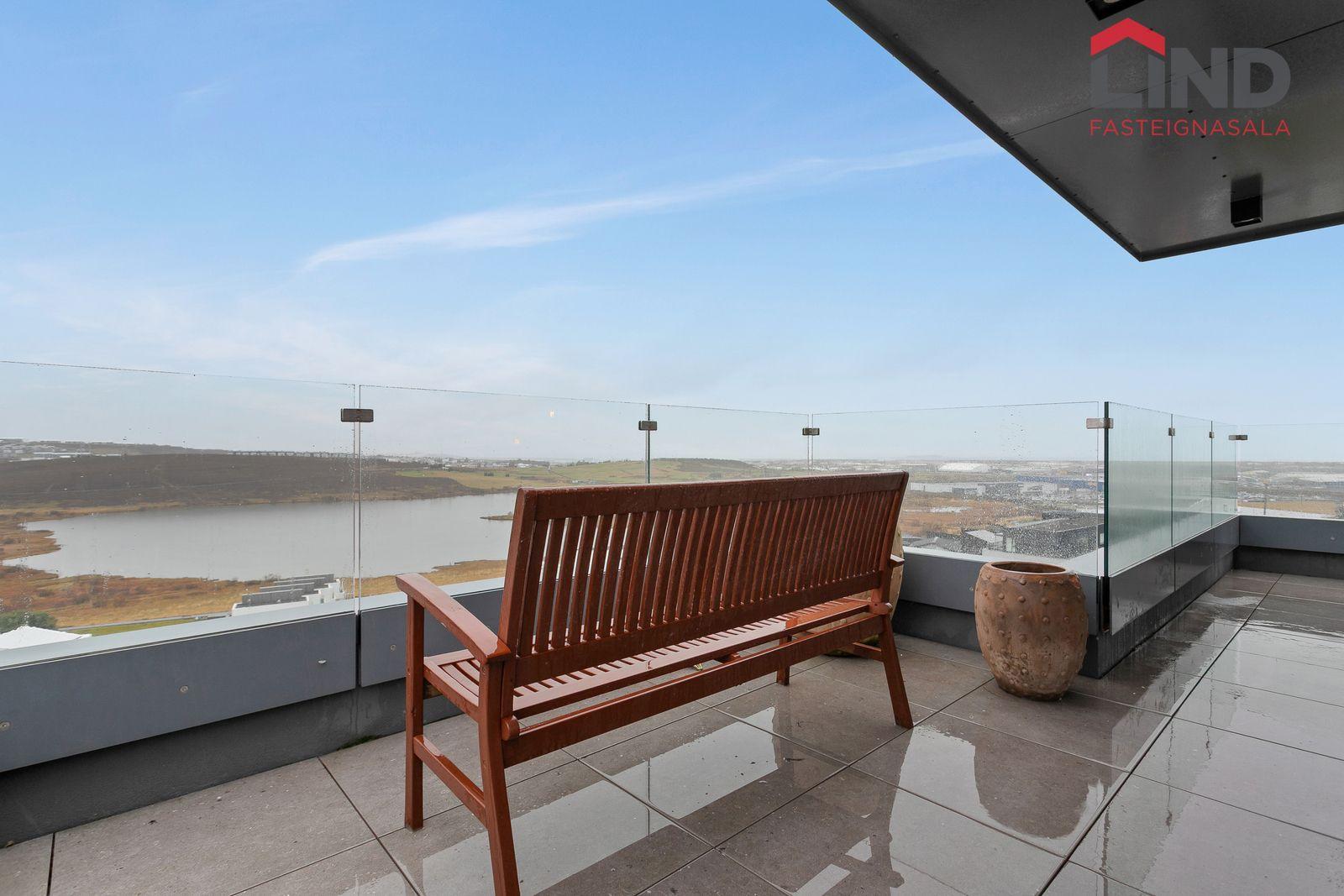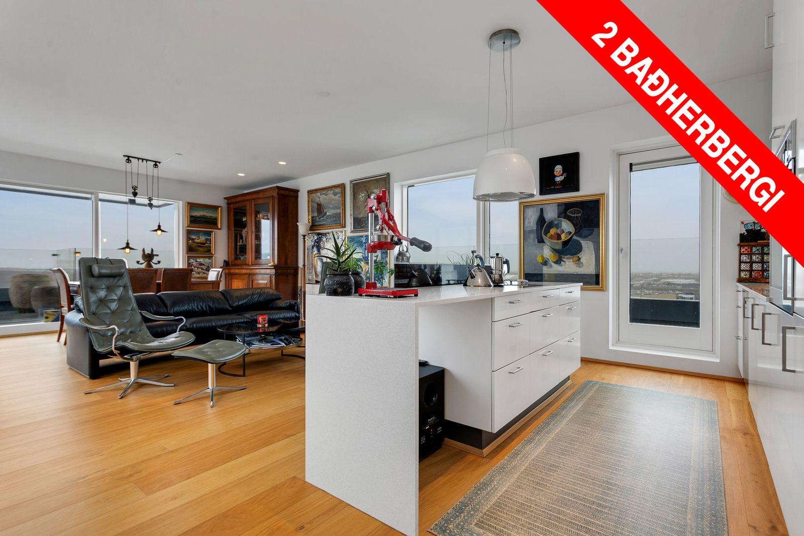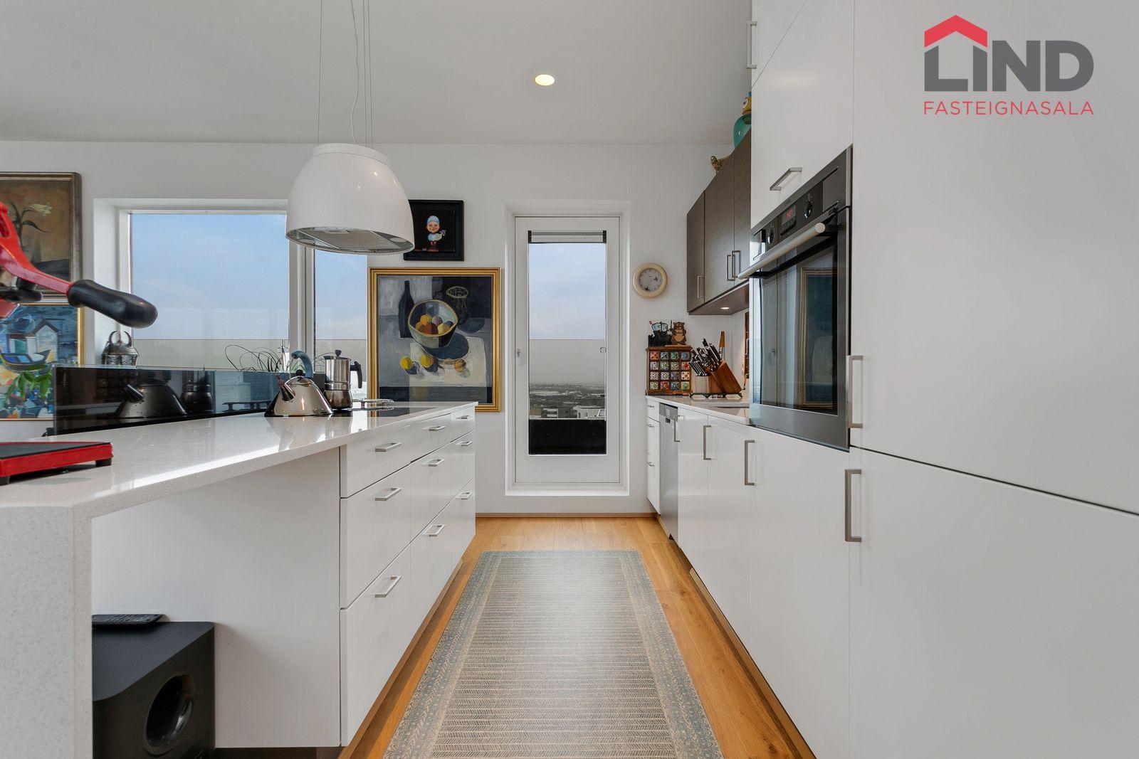 Eldhús: Vönduð innrétting með stórri eyju, granít borðlötur, útgengi út á þaksvalir með einstöku útsýni.