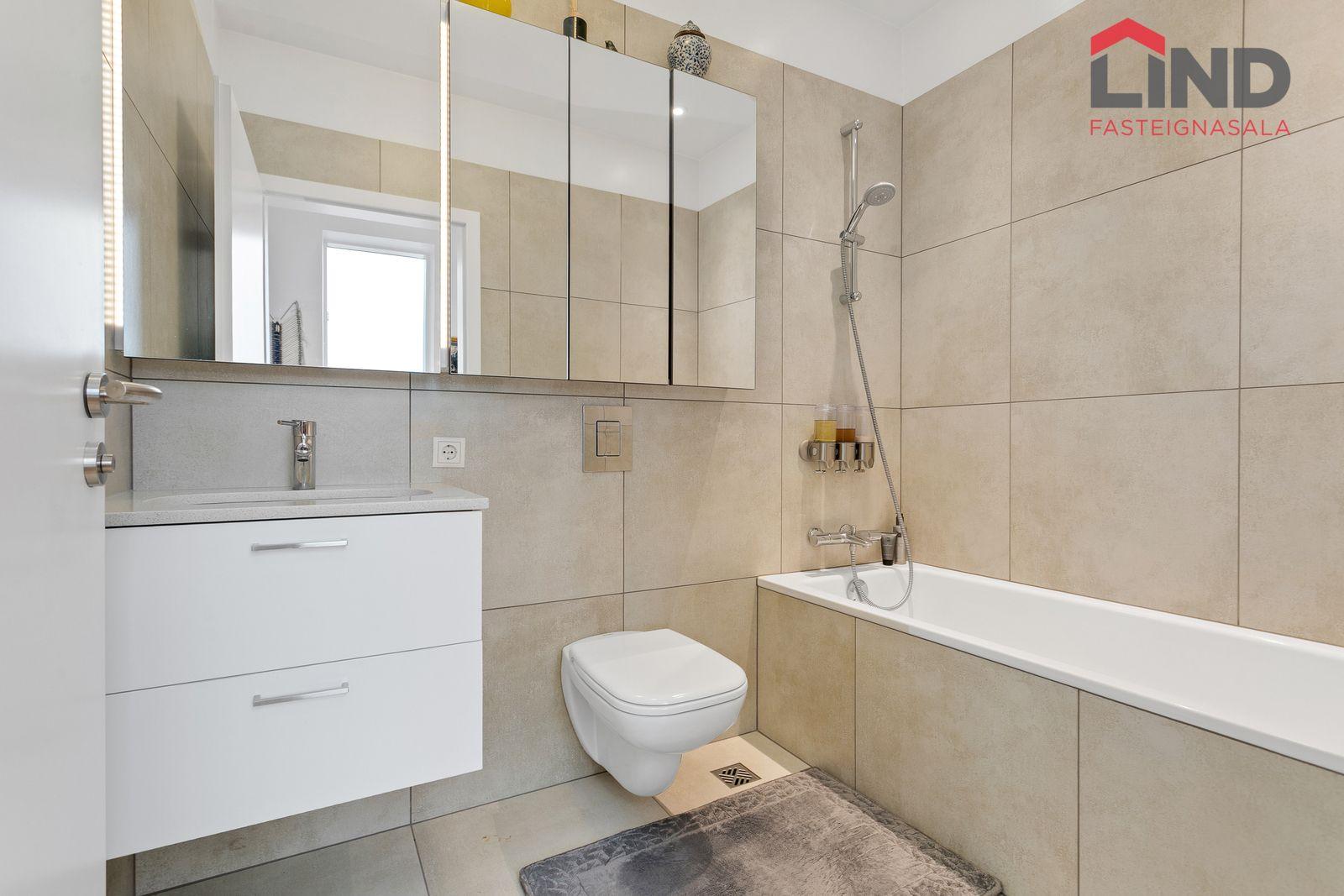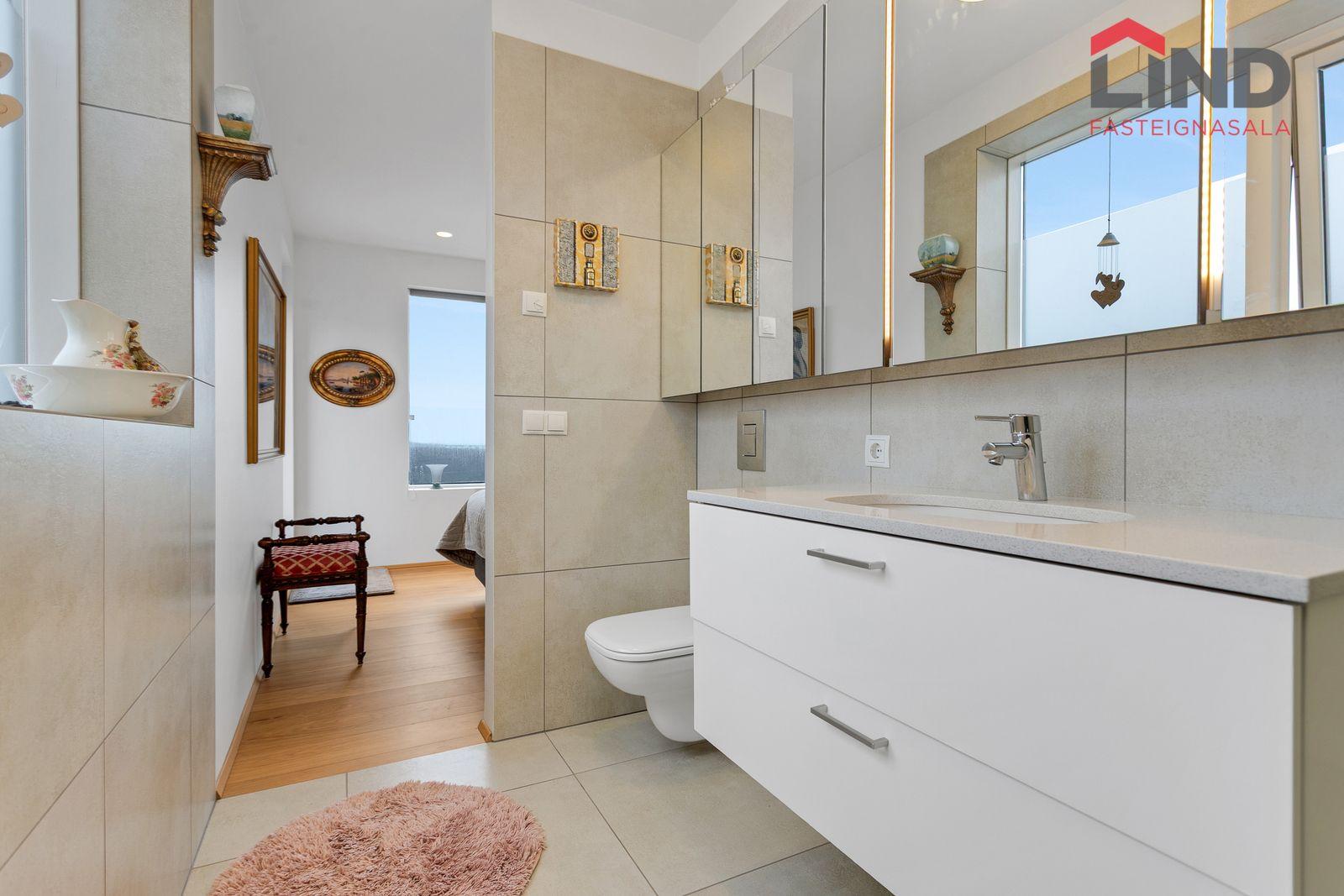 Baðherbergi: Flísalagt baðherbergi með vandaðri innréttingu ásamt baðkari.