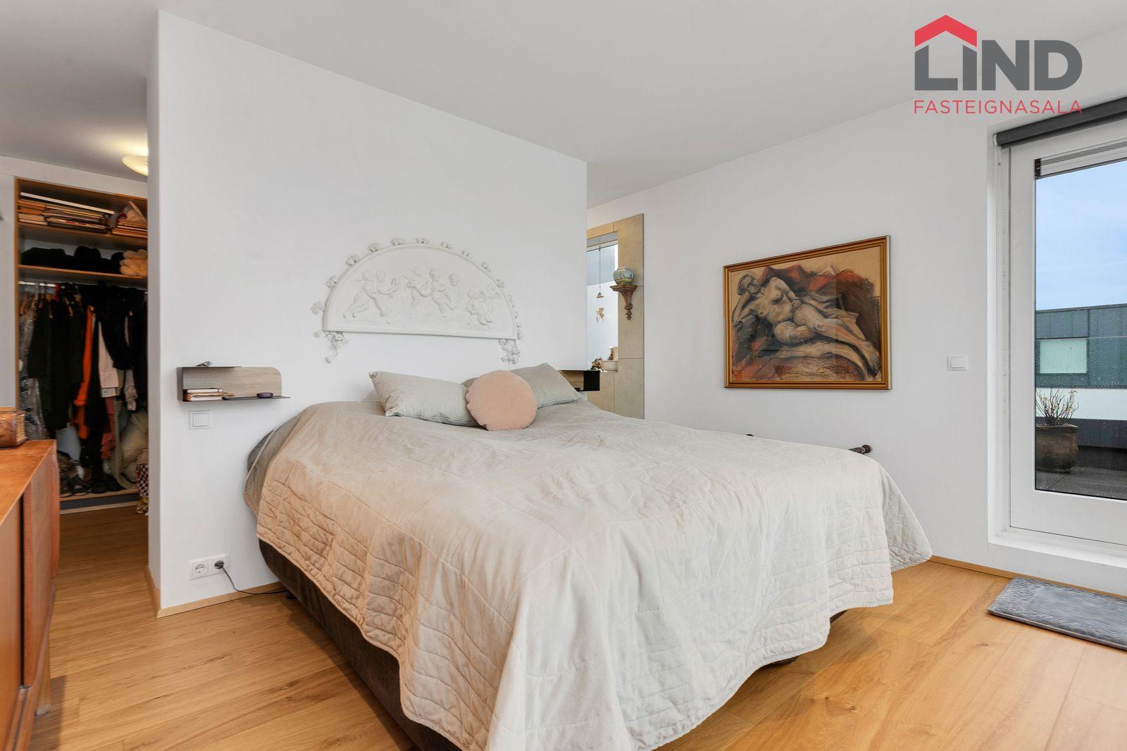 Svefnherbergi 1: Hjónasvíta með sér baðherbergi og fataherbergi útgengt út á þaksvalir með einstöku útsýni.