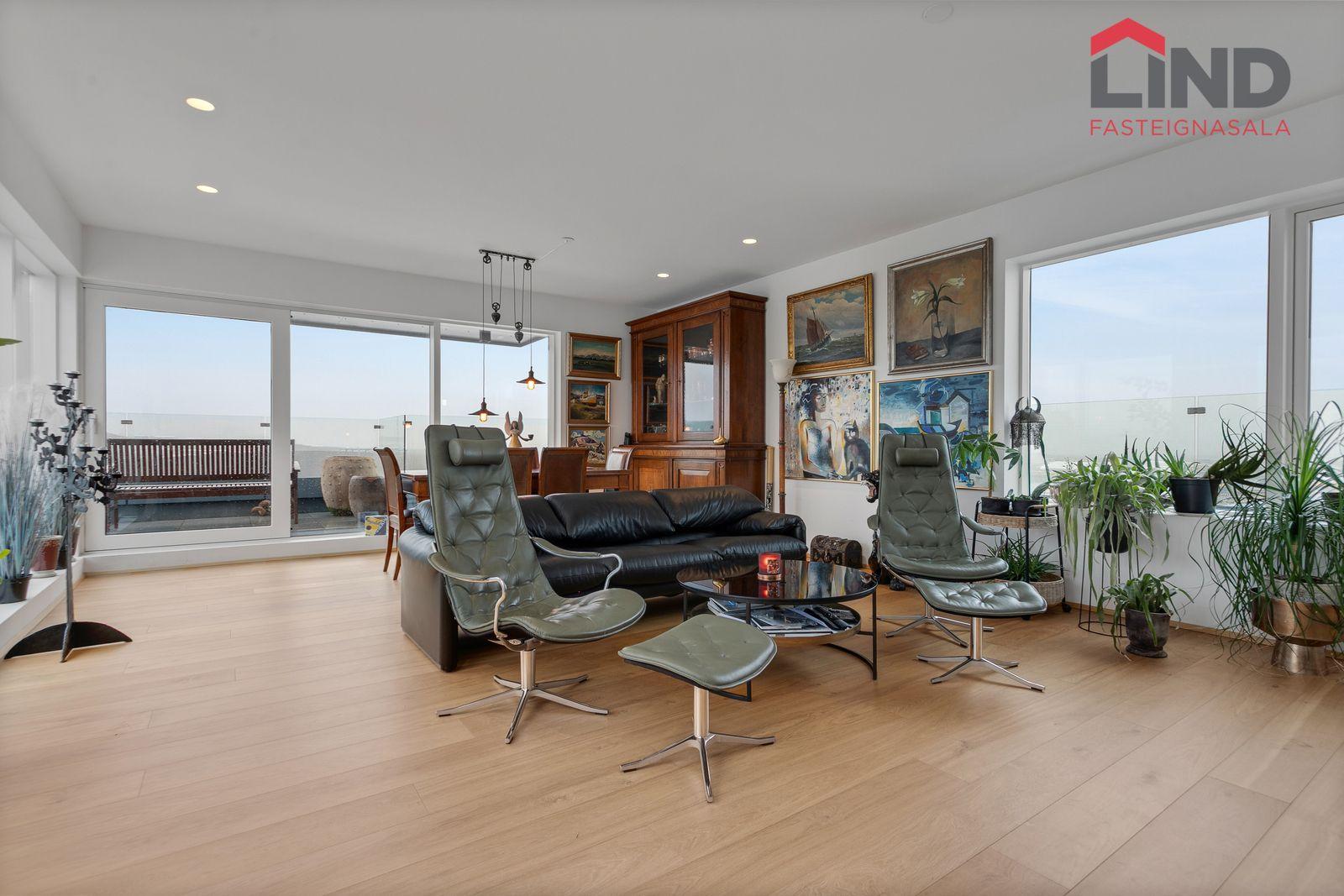 Stofa og borðstofa: Rúmgóðar og bjartar, útsýni úr öllum gluggum, útgengt út á þaksvalir með einstöku útsýni.