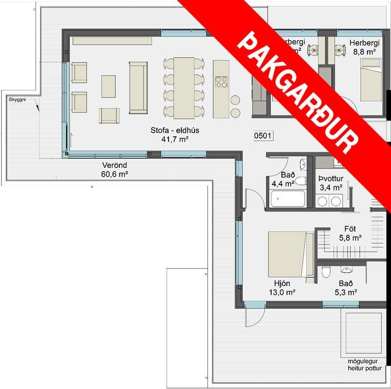 Þaksvalir: 60,6 fm þaksvalir, útgengt út á þremur stöðum.