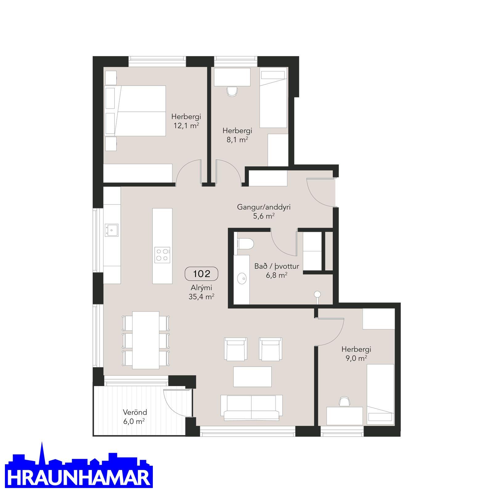Íbúð 102 er skráð 4ra herb. 104,6 fm þar af 9,3 fm geymsla með verönd og stæði B17 í bílageymsluAth. myndir geta verið af annarri íbúð og eru aðeins til viðmiðunar. Sjá heimasíðu verkefnisins hérNánari lýsing skv. teikningu:Forstofa með fataskápum,