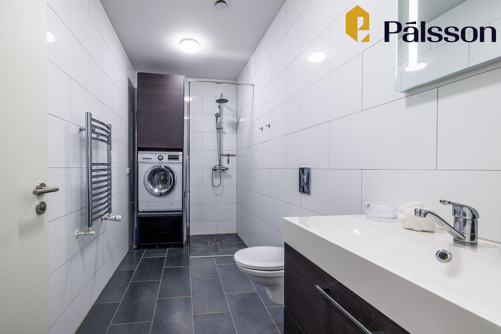 Baðherbergi er með innréttingu með innfelldum vaski, spegill með lýsingu, sturta með hertu öryggisgleri, handklæðaofn, upphengt salerni og tengi fyrir þvottavél. Gólf með dökkum flísum og veggir hvítum glansflísum.