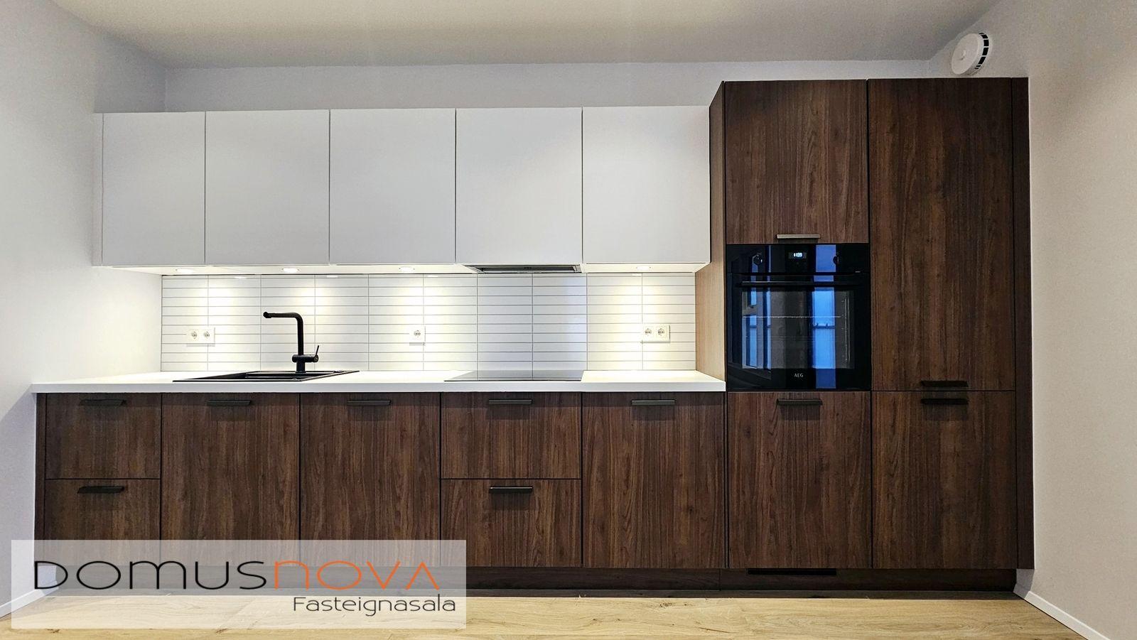 Eldhús: Vönduð brún Nobilia innrétting með hvítum efri skápum frá GKS innréttingar. Raftæki frá AEG, veggofn, spanhelluborð, innbyggð uppþvottavél og innbyggður kæliskápur með frysti. Vifta er frá Elica. Eldhúsvaskur og blöndunartæki er svart að lit og er frá Tengi. Harðparket á gólfi.