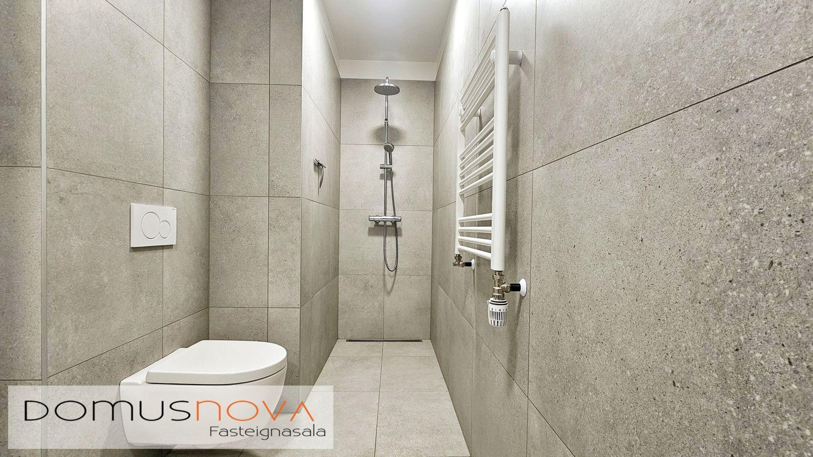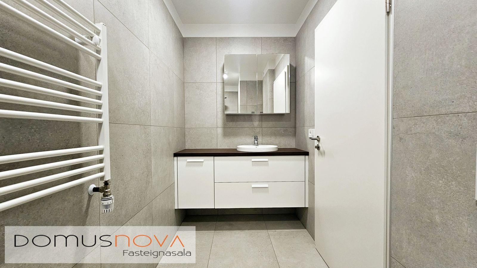 Baðherbergi: Hvít innrétting með brúnni borðplötu og hvítri handlaug. Speglaskápur yfir handlaug. Upphengt salerni með hæglokandi setu, WALK IN sturta og handklæðaofn. Hitastýrð blöndunartækin frá Tengi. Veggflísar og gegnheilar flísar á gólfi. Þvottaaðstaða er í sér skáp í miðrými eignar.