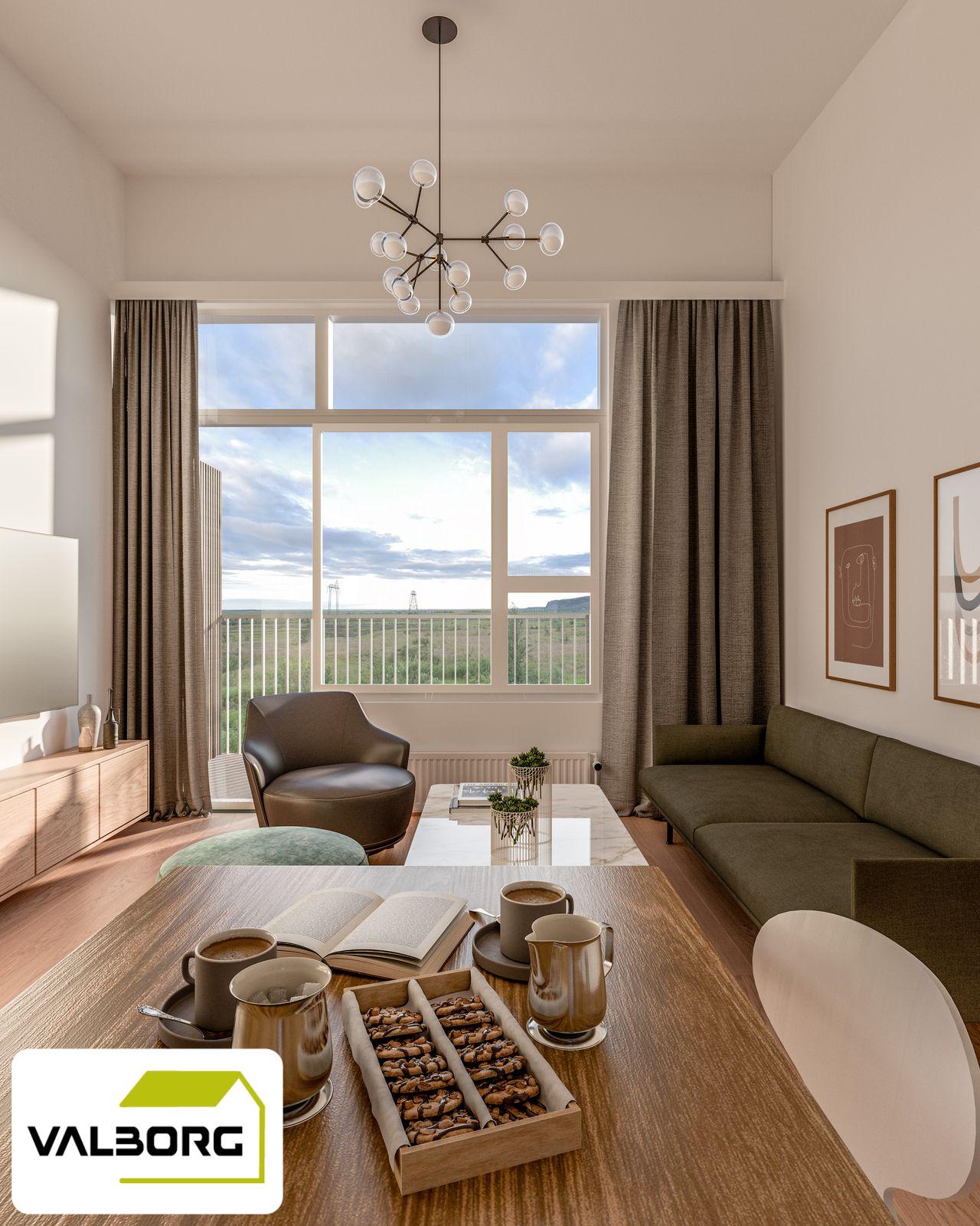 Alrými: eldhús og stofa eru saman í opnu rými og þar er útgengt á svalir.