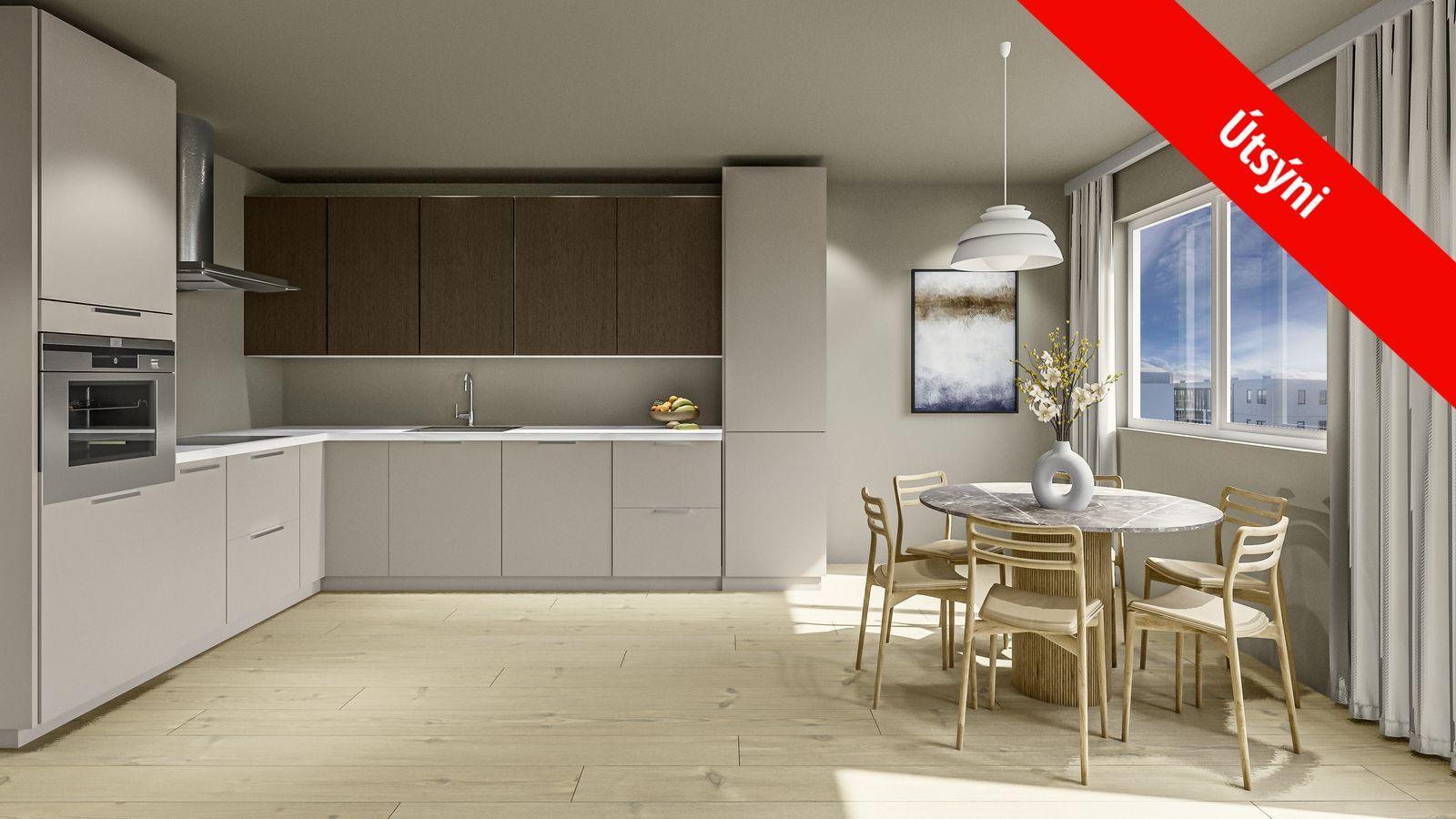 Gimli fasteignasala kynnir 3-4ra herbergja endaíbúð á fjórðu hæð (efstu) með sérinngangi af svölum í vönduðu nýju lyftuhúsi. Eignin verður tilbúin til afhendingar í byrjun árs 2026. Íbúðin sem er 98,9 fm að stærð (4,6 fm geymsla innan íbúðar) skilast fullfrágengin án gólfefna á meginrýmum en gólf votrýma verða flísalögð. Gluggar og svalahurðir eru ál/tré frá Gluggatækni ehf. Innréttingar og skápar frá HTH. Eldhúsinnrétting er tvítóna, með dökkri viðaráferð á efri skápum og ljósum neðri skápum. Aðrar innréttingar eru ljósar. Heimilistæki eru frá Ormsson, helluborð, ofn, háfur og innbyggð uppþvottavél. Innihurðir eru með mattri hvítri áferð og eru yfirfelldar. Gólf á baðherbergi er flísalagt og veggir flísalagðir að hluta, flísar frá Álfaborg. Á baði er upphengt salerni, sturta, vegleg vaskinnrétting, speglaskápur og innrétting fyrir þvottavél og þurrkara. Húsið er byggt úr forsteyptum einingum með staðsteyptum milliplötum.