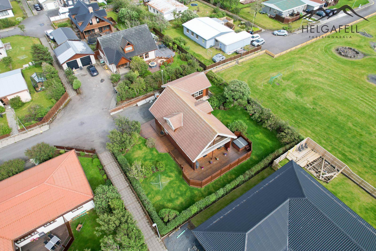 Lóð: Einstaklega falleg og gróin 797 fm lóð. Framan við húsið er möl í innkeyrslu og meðfram húsinu er timburpallur, á vesturhlið hússins er ca. 100 fm sólpallur og heitur pottur.