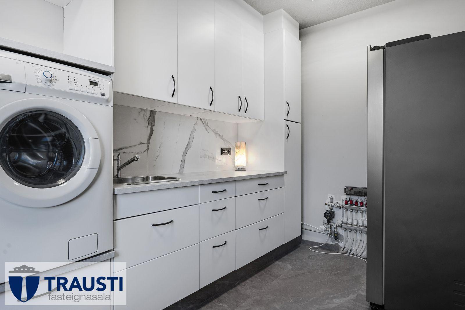 Þvottahús er inn af eldhúsi, mjög rúmgott, góð innrétting, þvottavél og þurrkari í vinnuhæð, vaskur og flísar á gólfi. Útgengt er út á svalir úr þvottahúsinu og þaðan er hægt að ganga niður í garðinn.