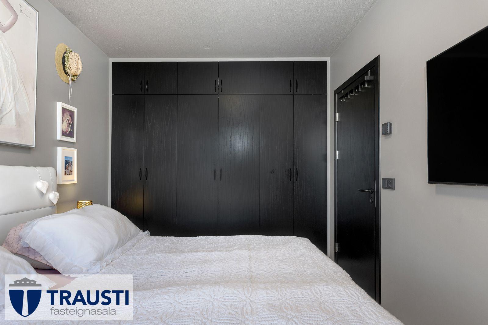 Hjónaherbergi er rúmgott með góðu skápaplássi sem ná upp í loft og flísar á gólfi.