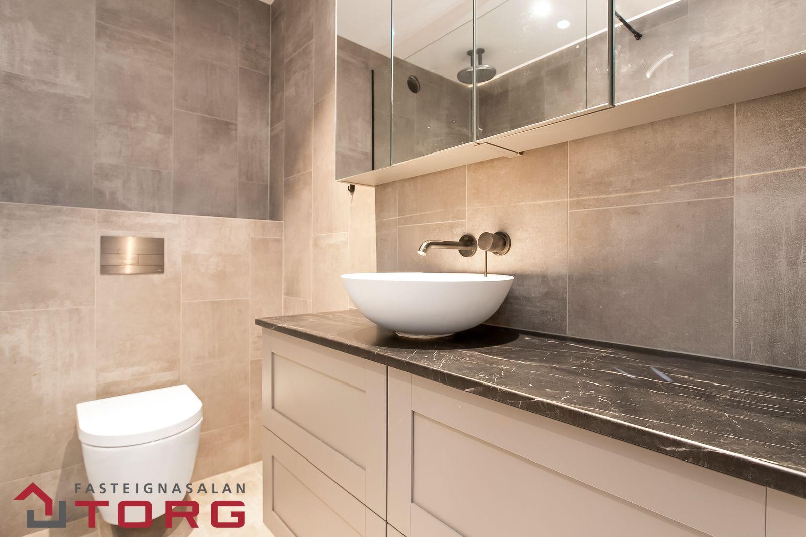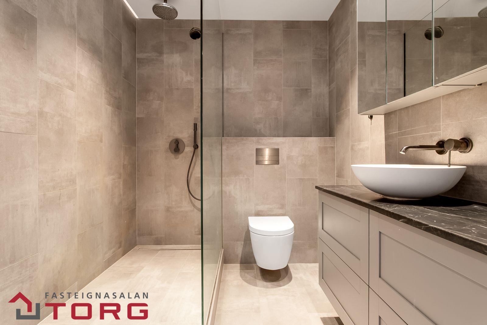 Baðherbergi. Fallega flísalagt. Stór walk in sturta. Upphengt salerni. Góð innrétting. Eigandi hefur látið útbúa aukið hillupláss inn á baðherbergi.