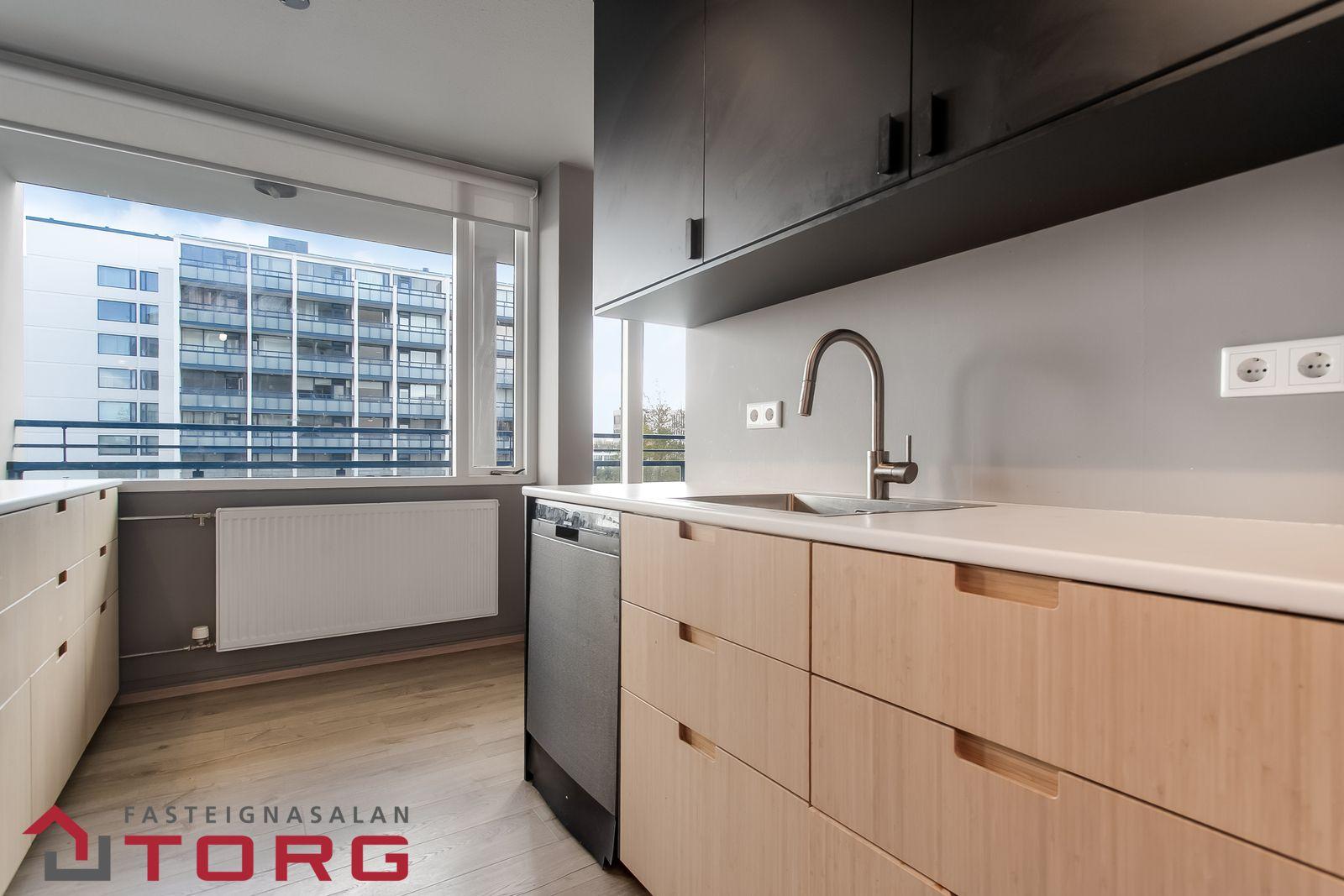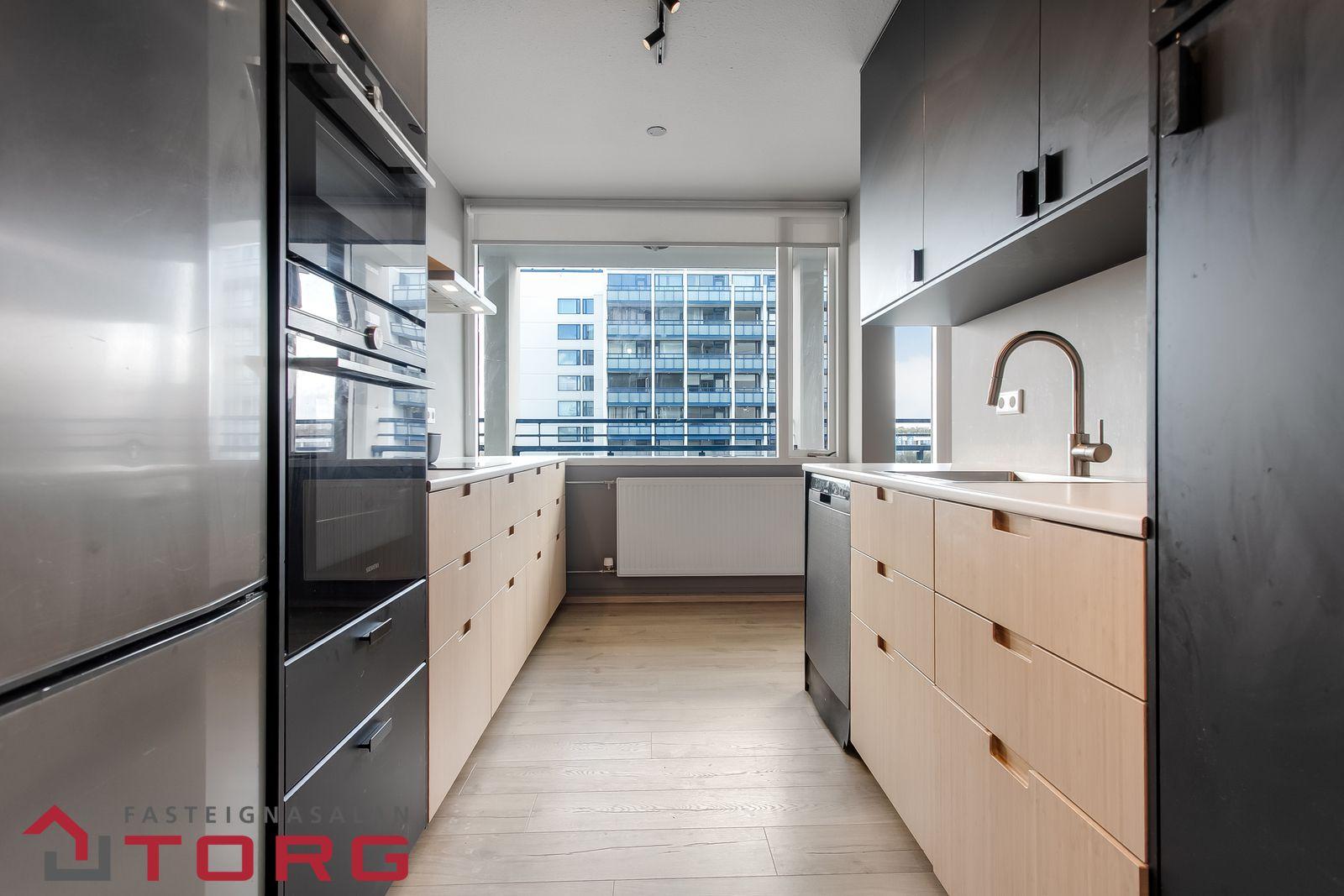 Eldhús. Nýlegar innréttingar og tæki, Bakaraofn í vinnuhæð, spanhelluborð, loftgleypir, tengi fyrir uppþvottavél. Vandaðar innréttingar sem ná upp í loft.