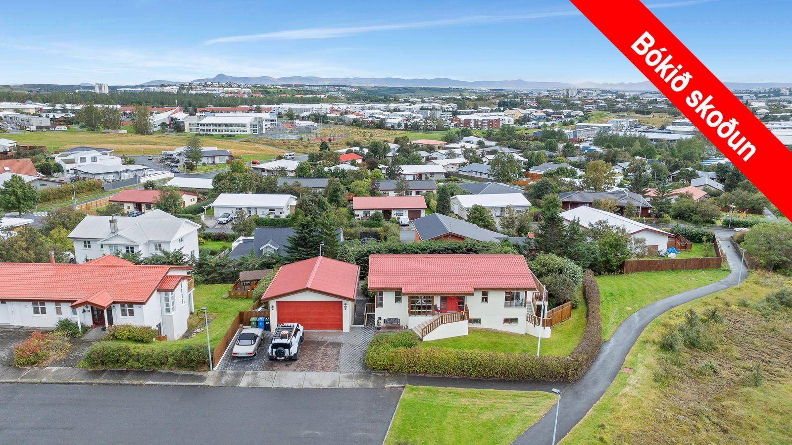 Eignin stendur á 939,0 fermetra glæsilegri lóð á virkilega fallegum og rólegum stað innst í botnlanga á fallegum útsýnisstað við opið svæði. Stórar flísalagðar svalir eru út af efri hæð hússins á suður og vesturhlið með stiga niður á lóð. Stór og skjólsæl viðarverönd er til suðurs útaf neðri hæð hússins. Hellulögð stétt og upphituð hellulögð innkeyrsla er framan við bílskúr sem rúmar vel þrjá bíla.