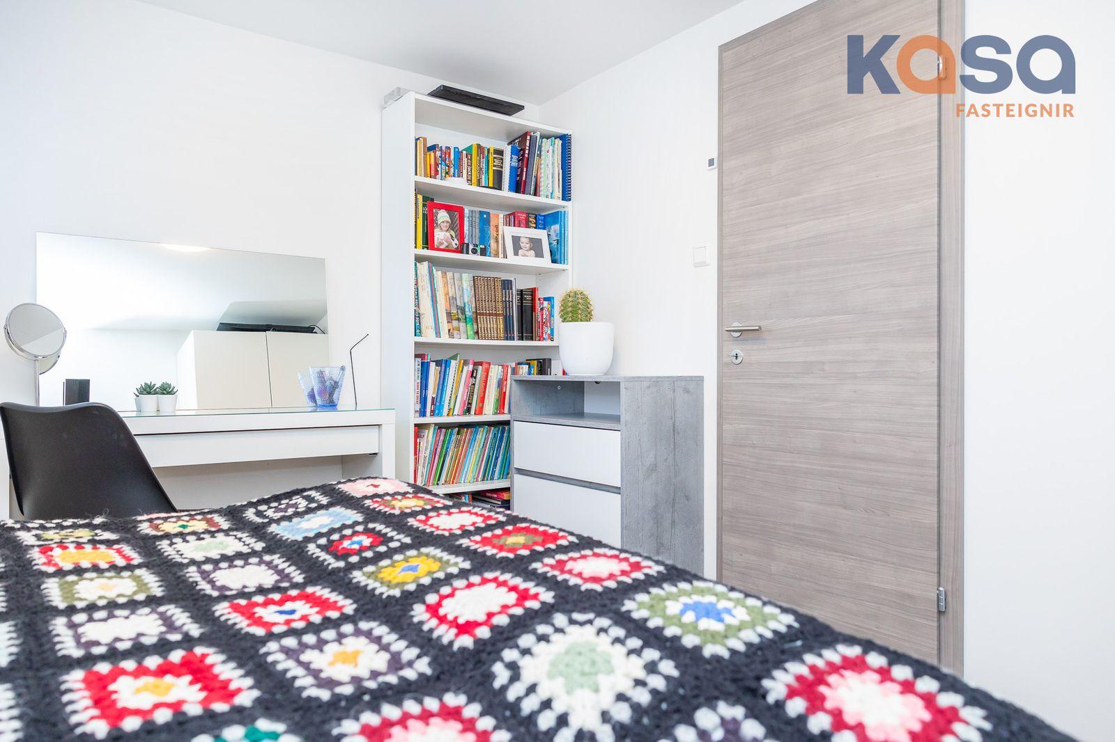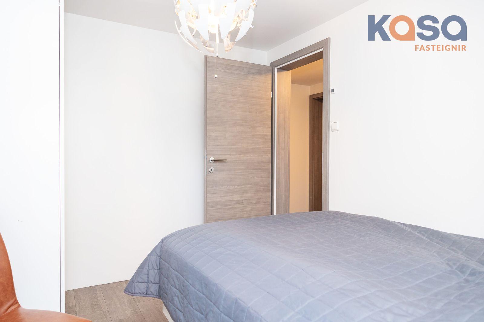 Hjónaherbergi: Rúmgott herbergi með stórum fataskáp, út úr herberginu er gengið á aðrar suðursvalir.