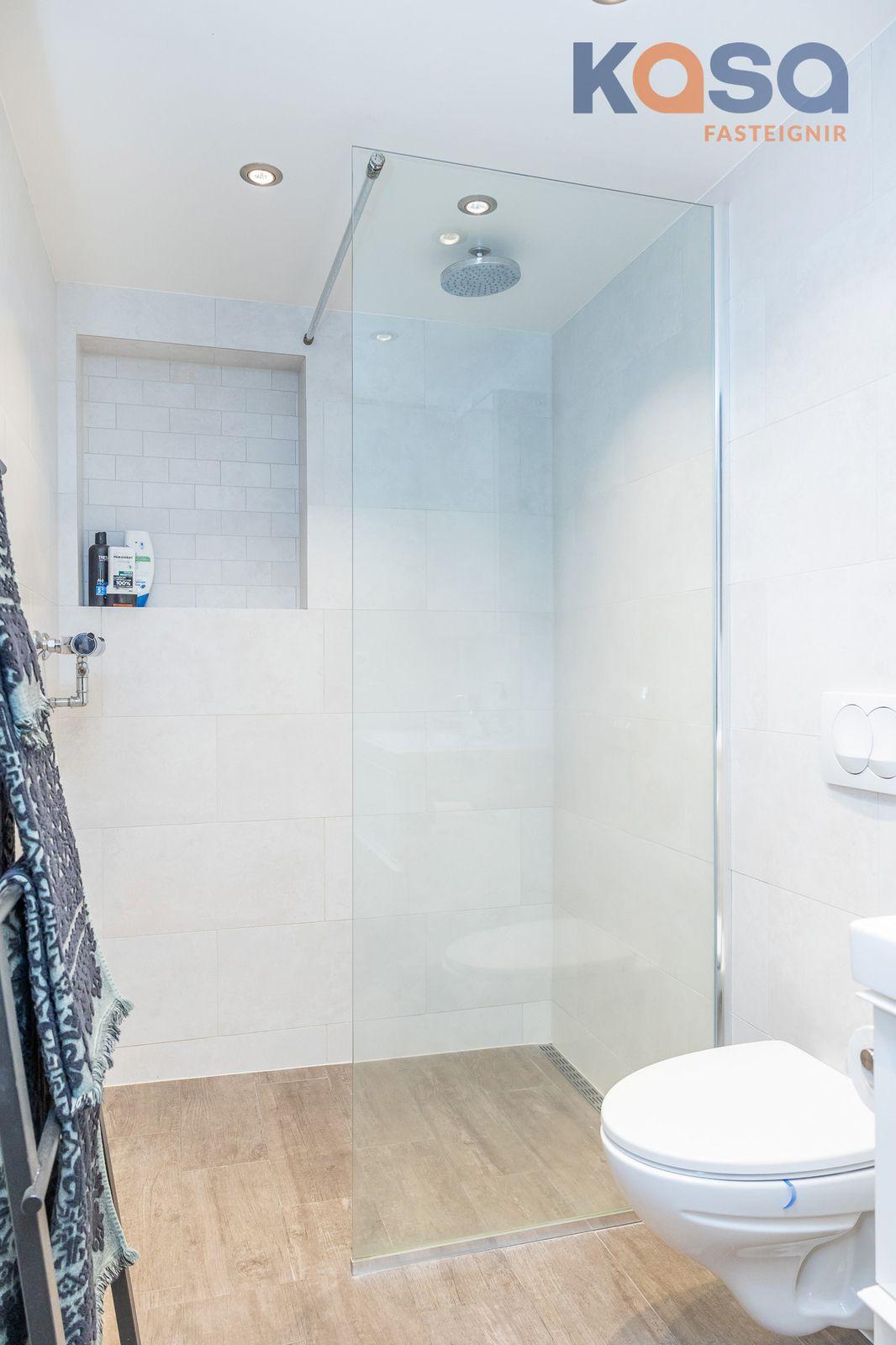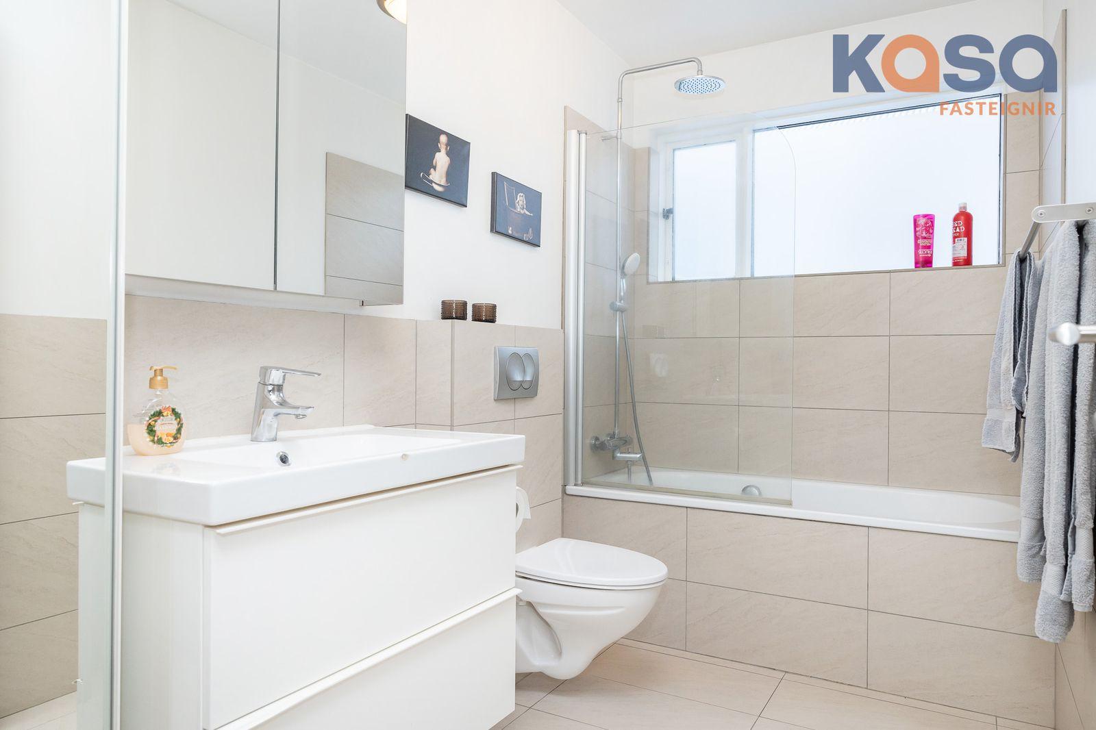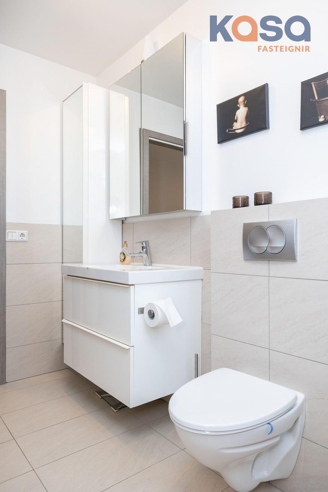 Baðherbergi: Flísalagt gólf og hluti veggja. Hvít skúffu innrétting, handklæðaskápur og speglaskápur. Baðkar með sturtutækjum og gleri. Vegghengt salerni. Opnanlegur gluggi er á rýminu.