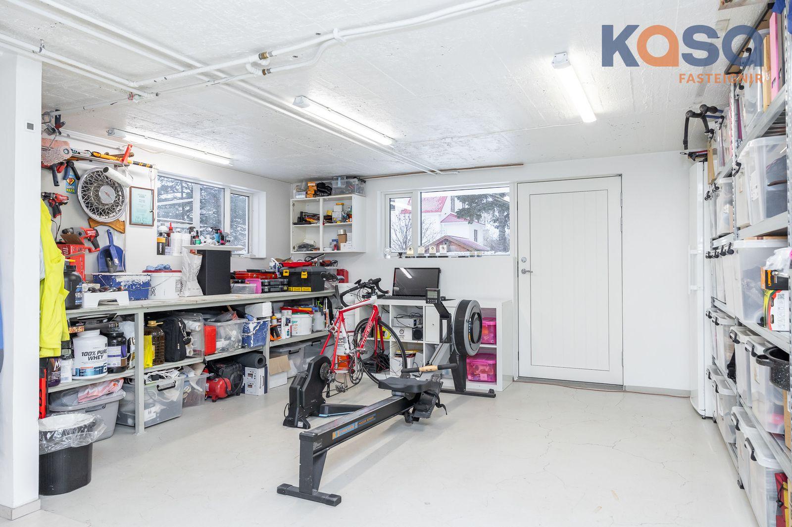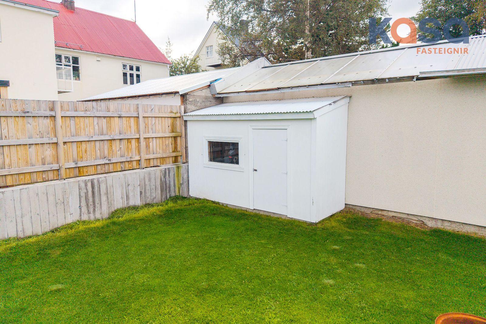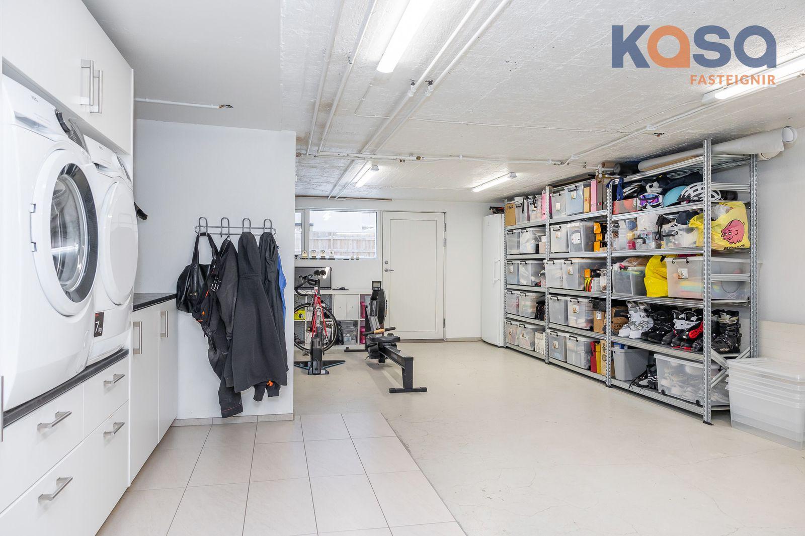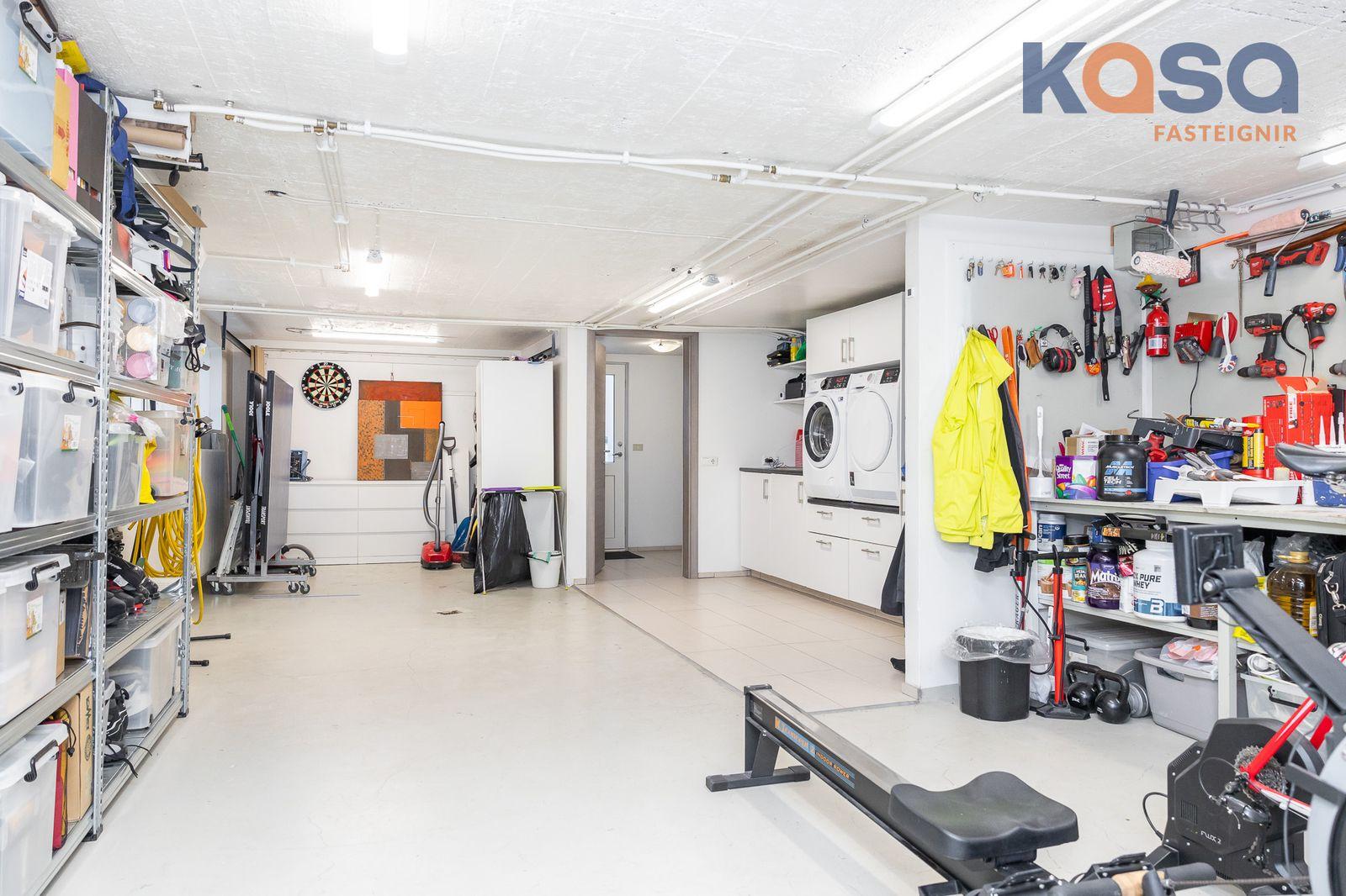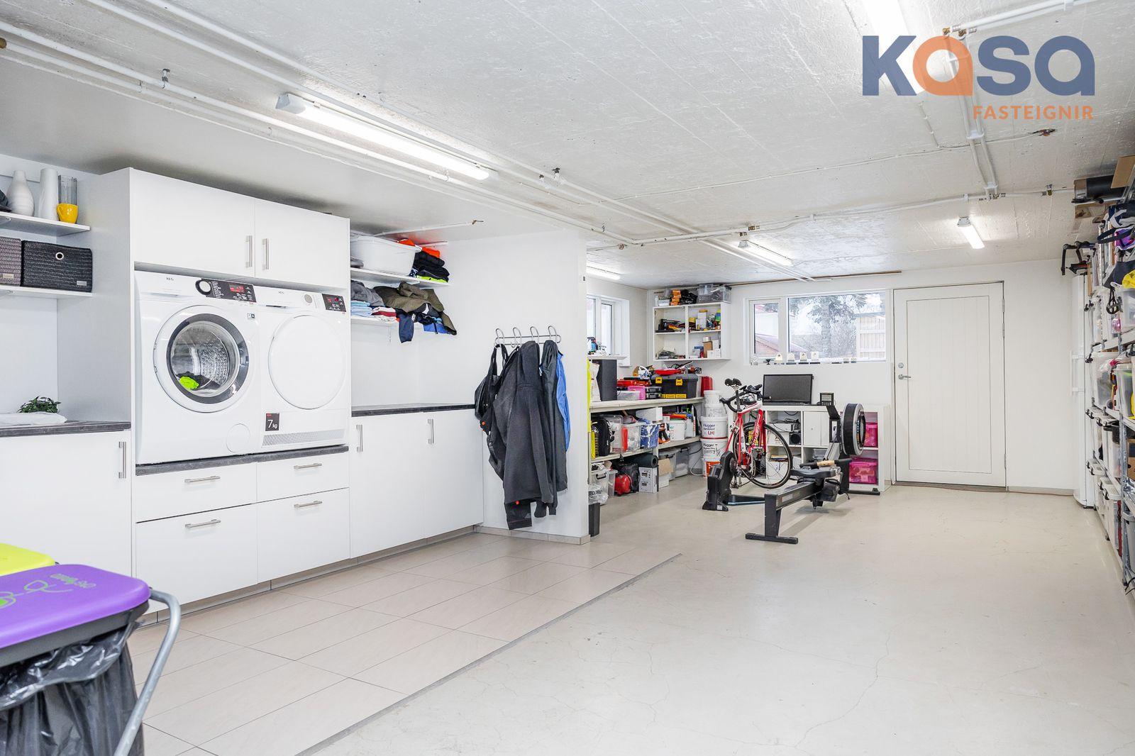 Bílskúr: Lakkað gólf. Rúmgott rými sem nýtist vel sem geymsla fyrir hobbytæki. Erfitt er að koma bíl inn í skúrinn en önnur leiktæki komast inn. Bílskúrshurð er ágæt og virkar en er ekki rafdrifin. Gönguhurð er út á lóð úr skúrnum. Á lóðinni er lítil köld geymsla.