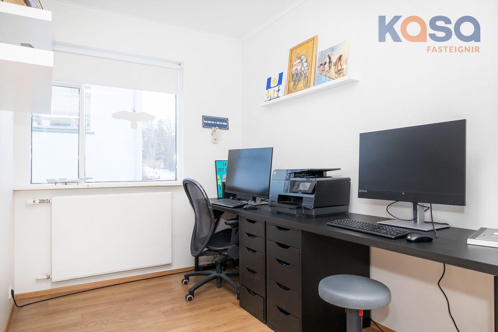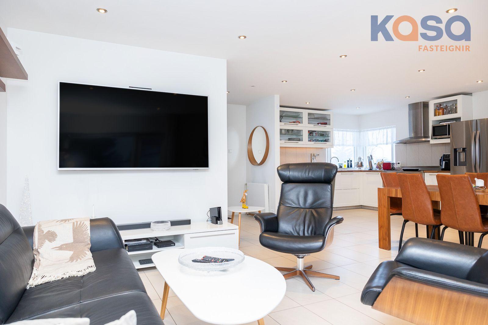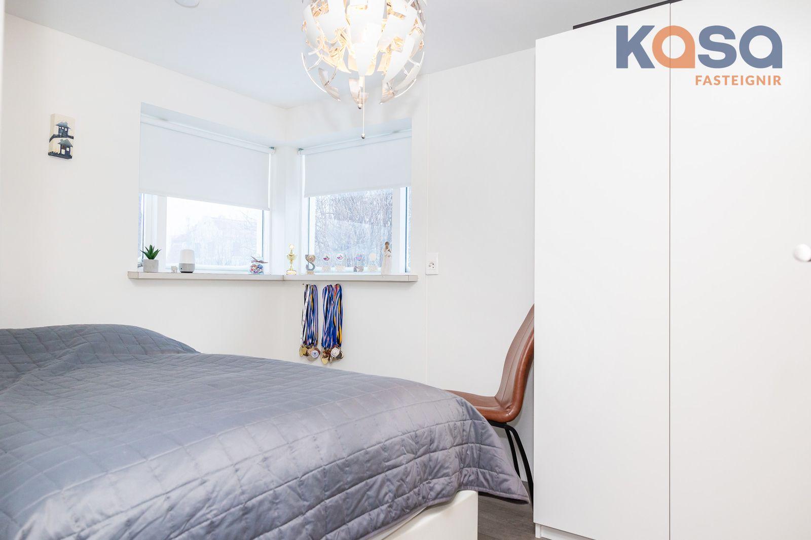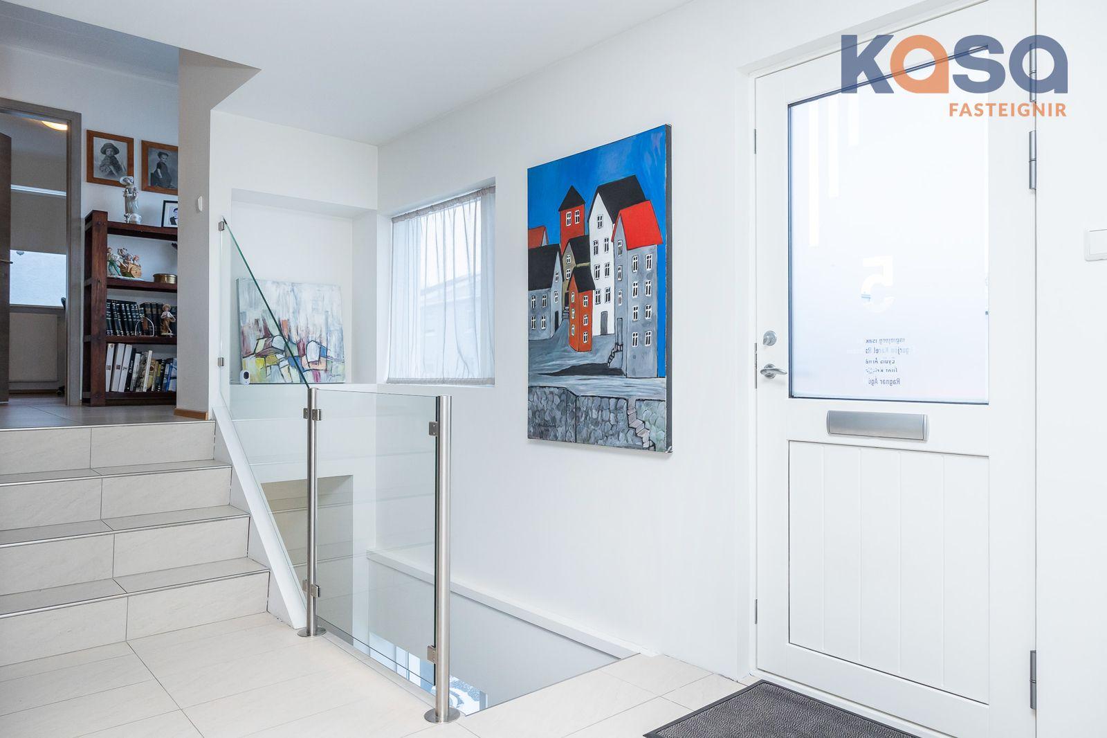 Komið er inn í forstofu á miðhæð, inn af henni er stofa og eldhús saman í rúmgóðu alrými, þar er hurð út á suðursvalir. Gengið er upp á efripall af miðhæð, en þar er hjónaherbergi, baðherbergi og tvö barnaherbergi. Gengið er niður í aðra forstofu af miðhæð, inn af henni er rúmgóð geymsla/skúr og þvottahús, samtals er rýmið um 50 fm. Úr sömu forstofu er gengið á neðrihæð hússins, þar eru í dag þrjú herbergi, baðherbergi og sjónvarpshol. Sér inngangur er í rýmið og því mjög auðvelt að gera það að útleigu einingu en allar lagnir fyrir eldhús eru til staðar í einu herberginu.