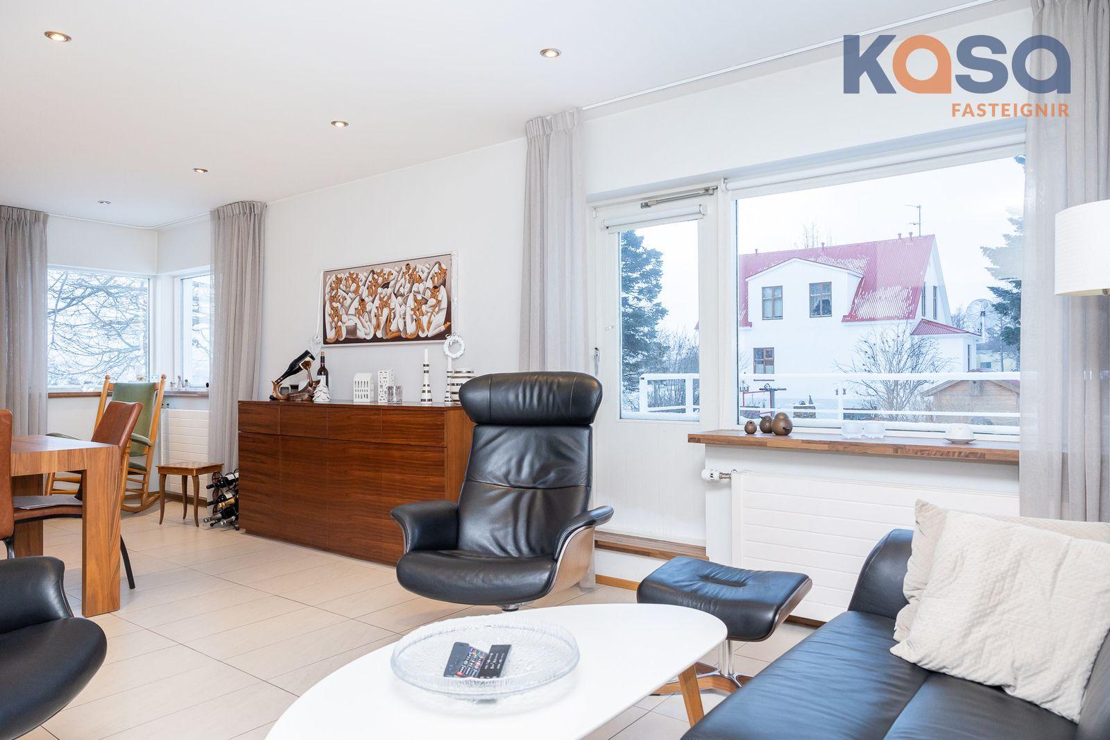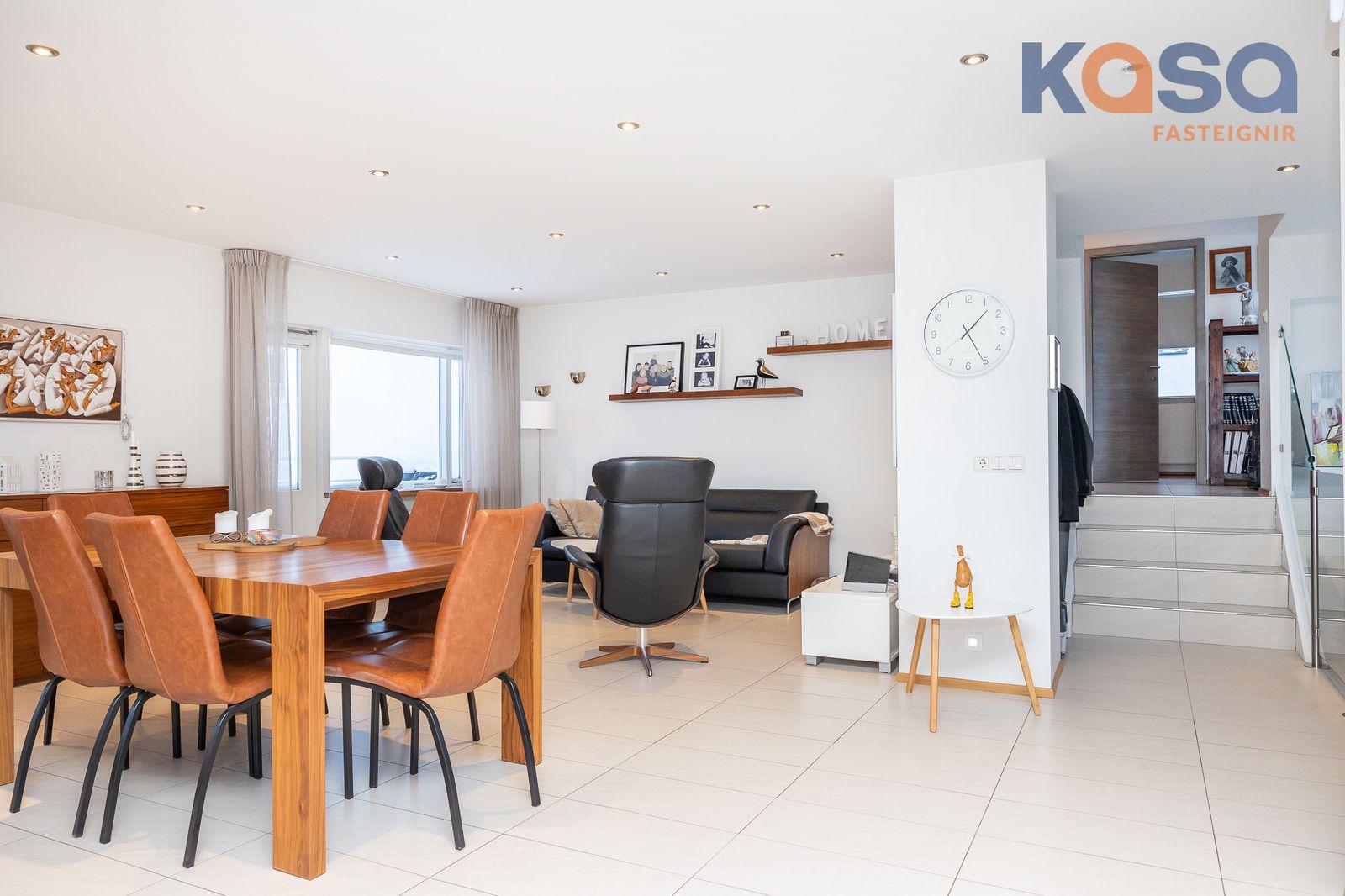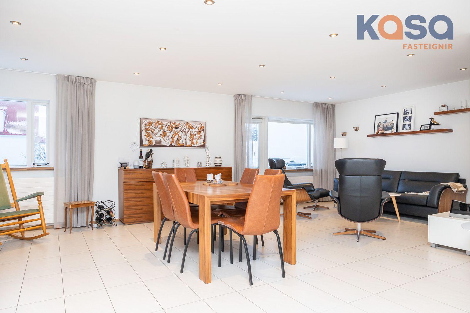 Stofa: Rúmgott rými sem nýtist bæði sem borðstofa og sjónvarpshol. Út frá rýminu er gengið á suður svalir með tröppum niður í garð.