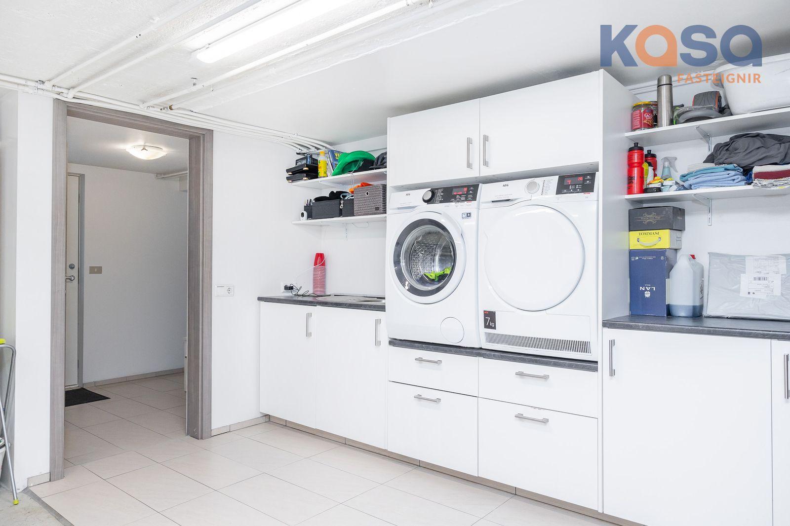 Þvottahús: Flísar á gólfi, rúmgóð hvít innrétting með plássi fyrir þvottavél og þurrkara. Vaskur í borðplötu.