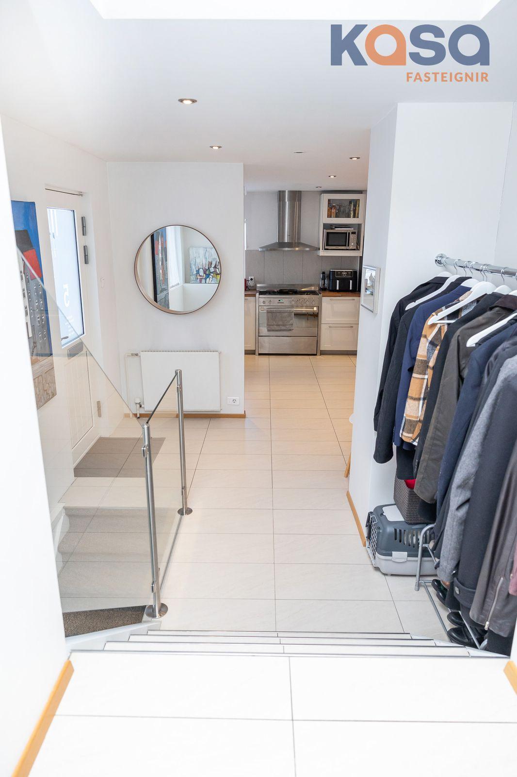 Miðhæð er öll með ljósum flísum á gólfum og innfeldri lýsingu í loftum.