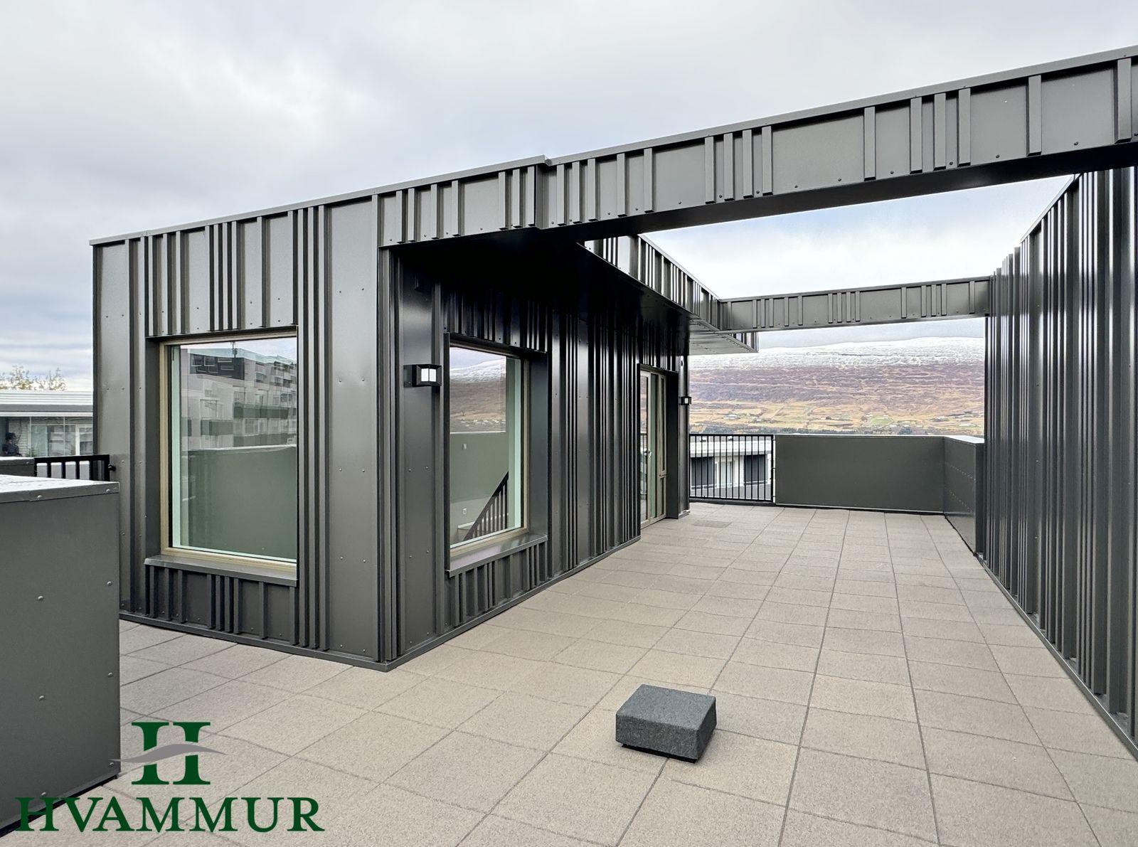 * Rúmlega 55 m² þaksvalir þar sem möguleiki er að koma fyrir heitum potti og útisturtu Forstofa verður með harð parketi gólfi og fjórföldum fataskáp.