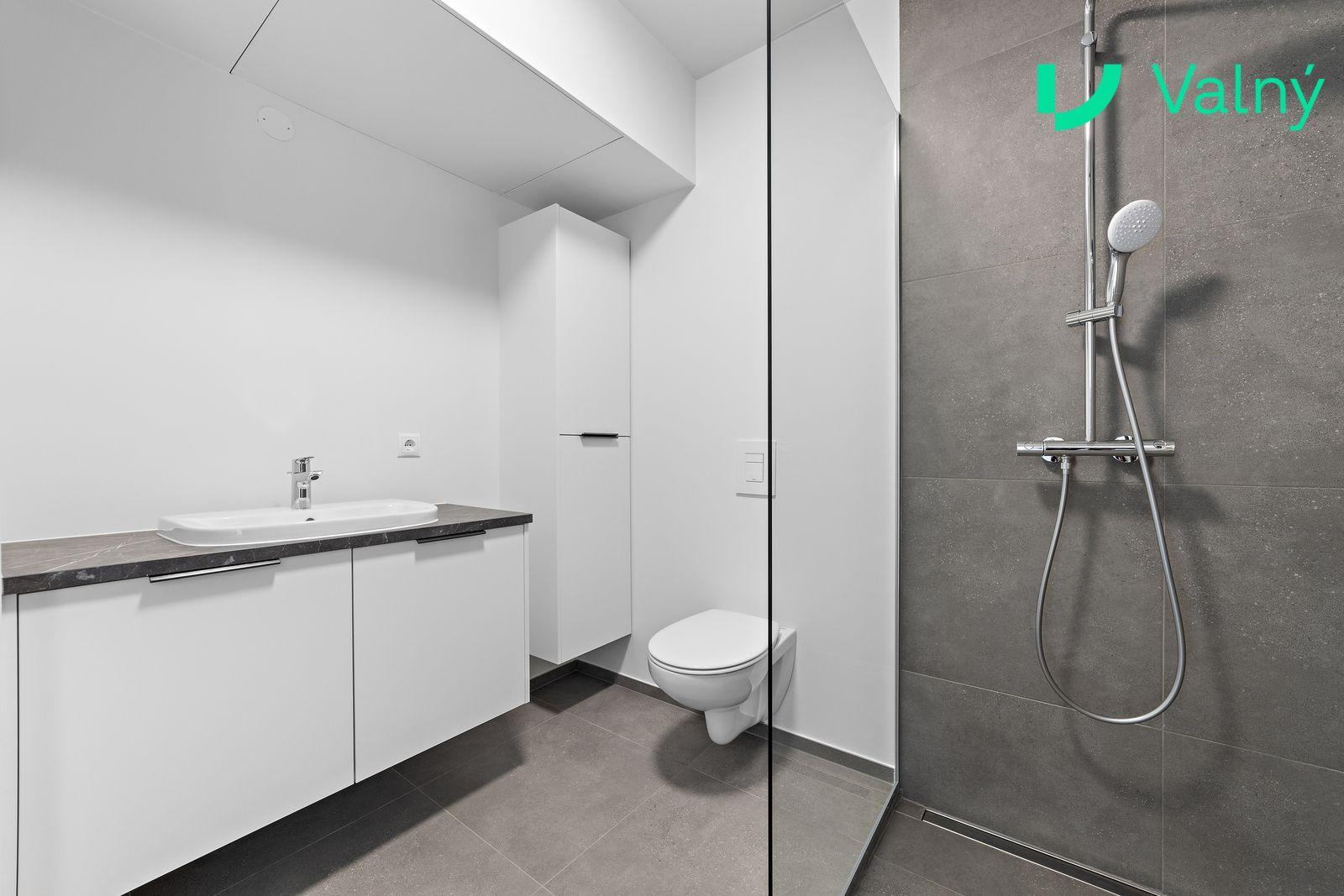 Baðherbergi flísalagt (30×60 cm eða 60×60 cm þar sem við á) á gólfi og veggjum að hluta. Upphengt salerni, handklæðaofn og flísalögð walk-in sturta. Speglar fylgja ekki.