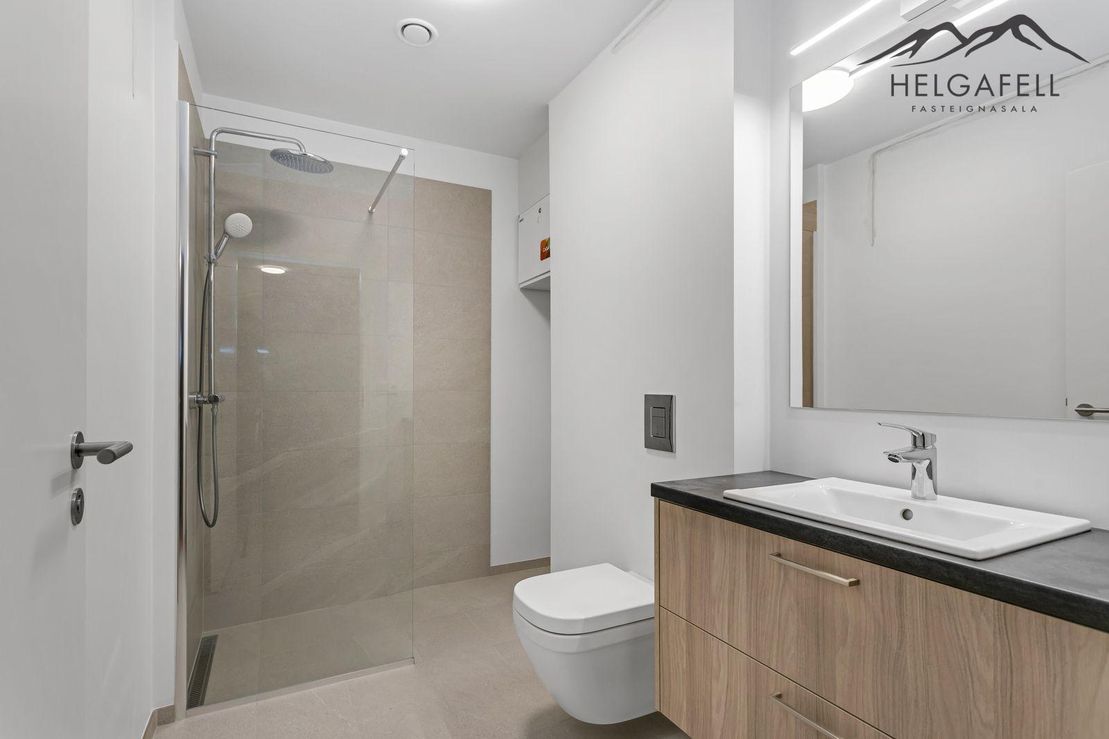 Gólfhiti er á baðherbergi, auk þvottaaðstöðu.
