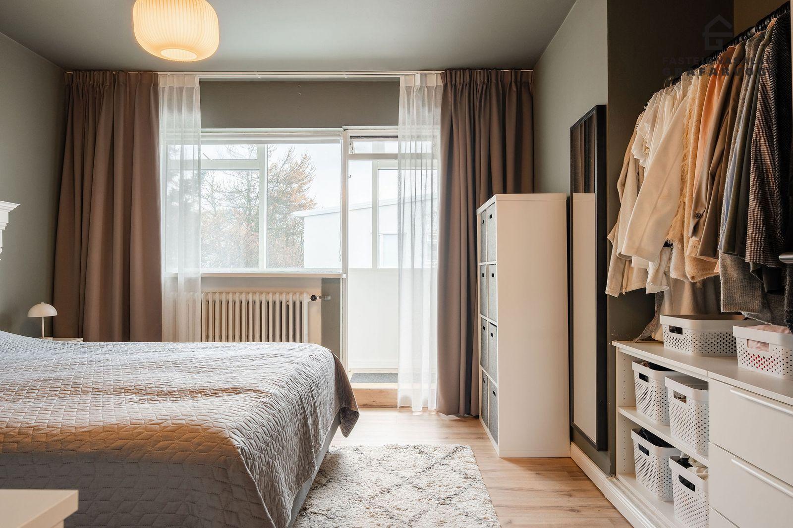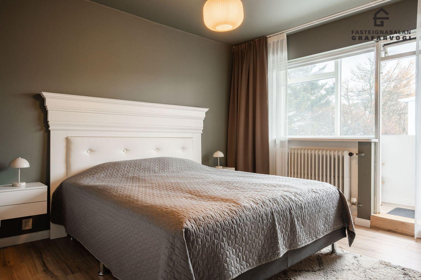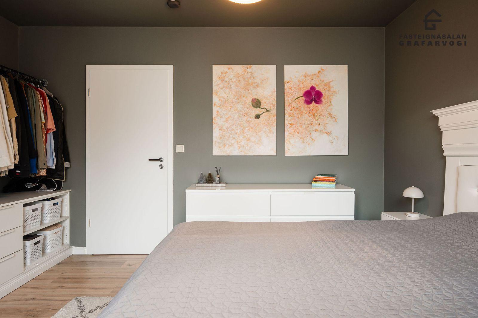 Svefnherbergi: Þrjú svefnherbergi eru þrjú innan íbúðar. Hjónaherbergið er mjög rúmgott með opnu fatahengi og innbyggðum kommóðum, þaðan er útgengt út á stórar yfirbyggðar svalir. Til viðbótar eru svo tvö önnur svefnherbergi bæði parketlögð.