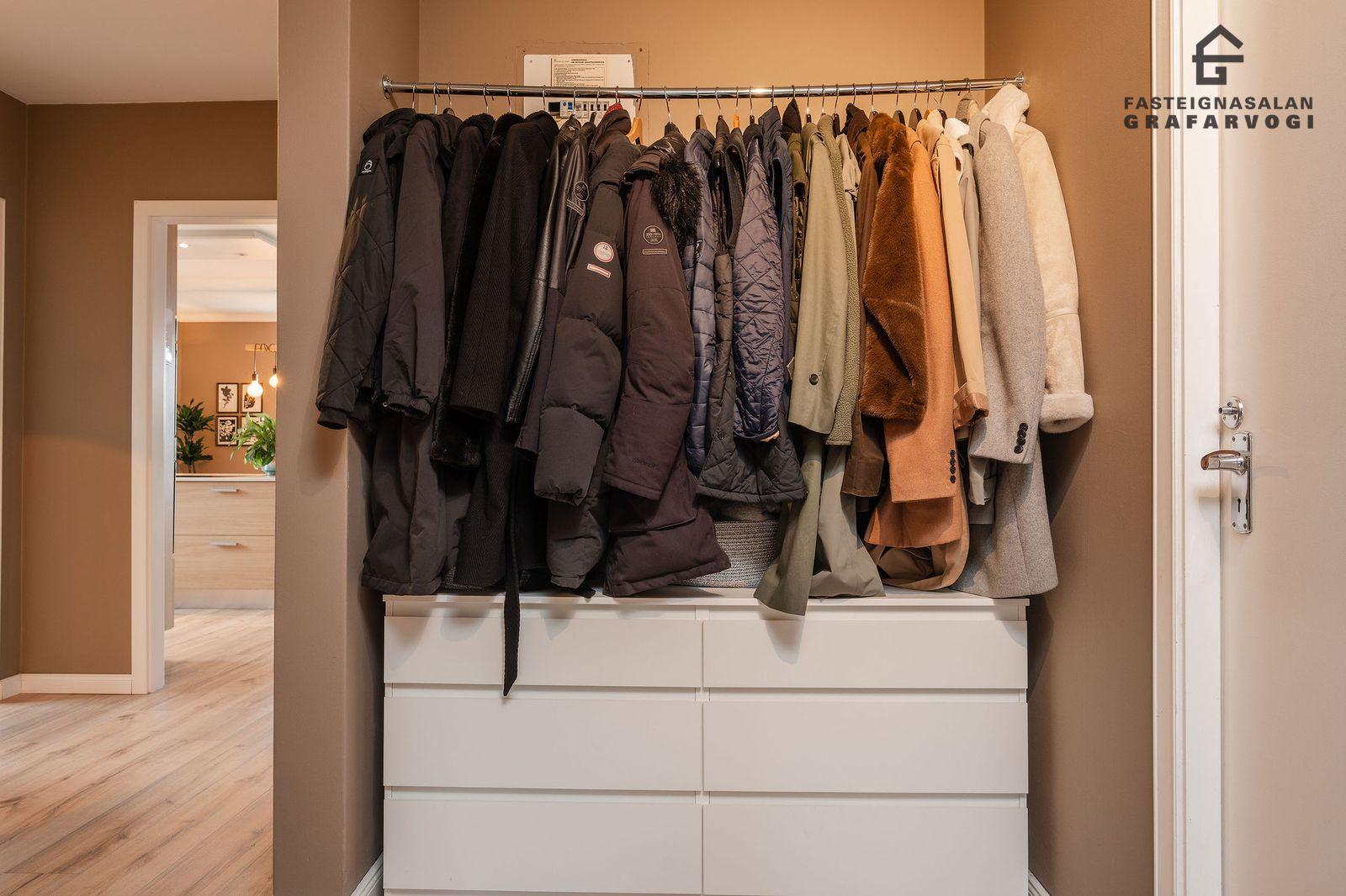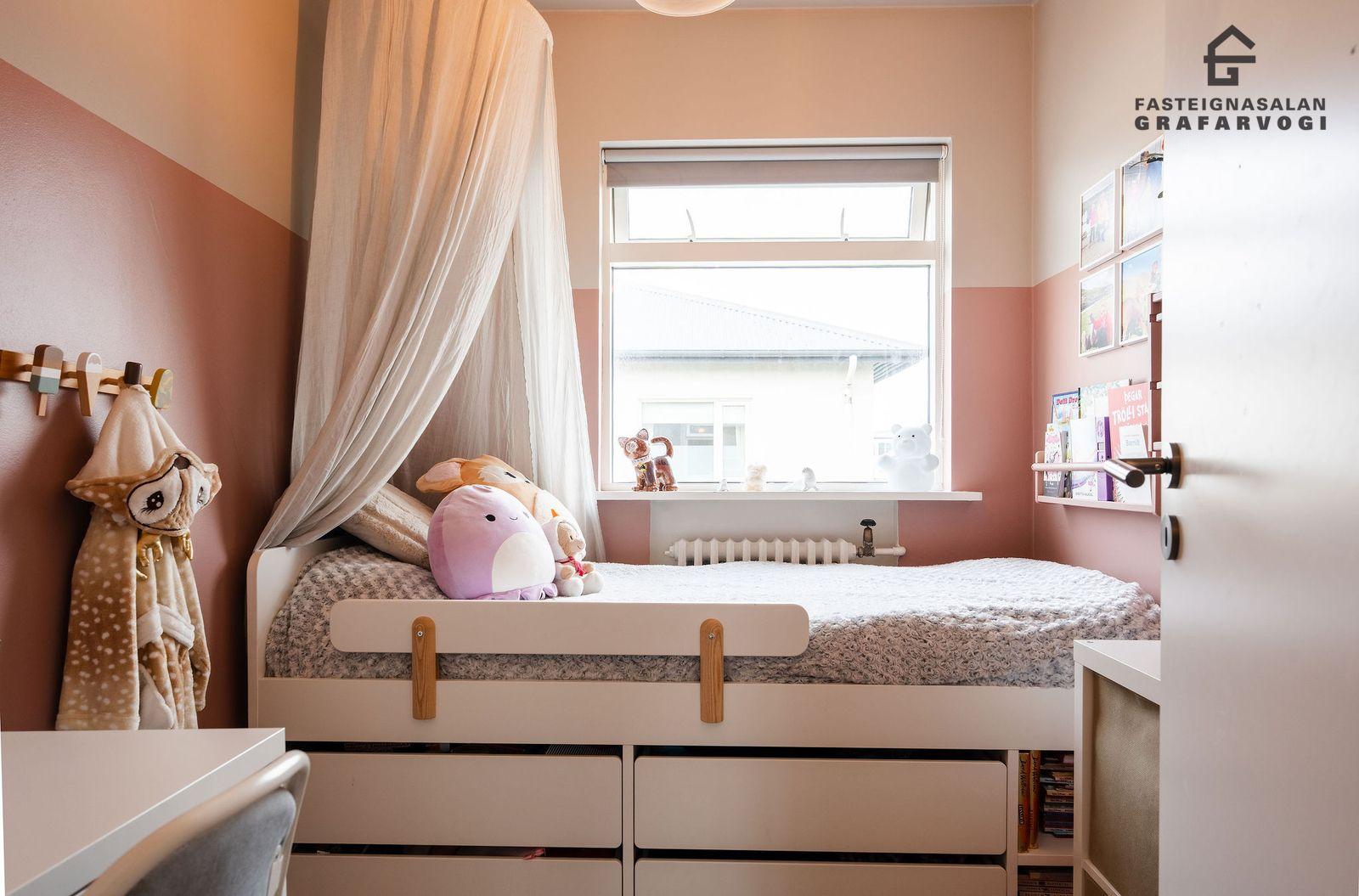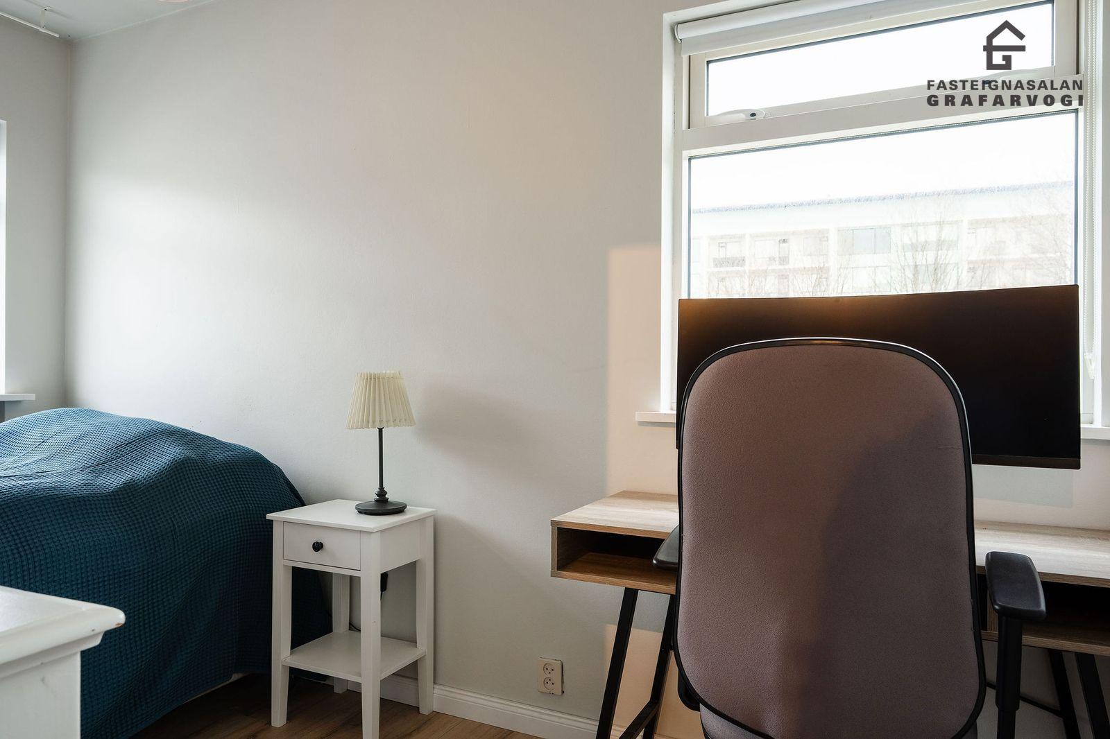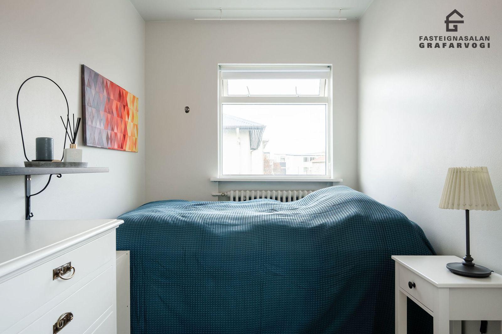 Svefnherbergi: Þrjú svefnherbergi eru þrjú innan íbúðar. Hjónaherbergið er mjög rúmgott með opnu fatahengi og innbyggðum kommóðum, þaðan er útgengt út á stórar yfirbyggðar svalir. Til viðbótar eru svo tvö önnur svefnherbergi bæði parketlögð.