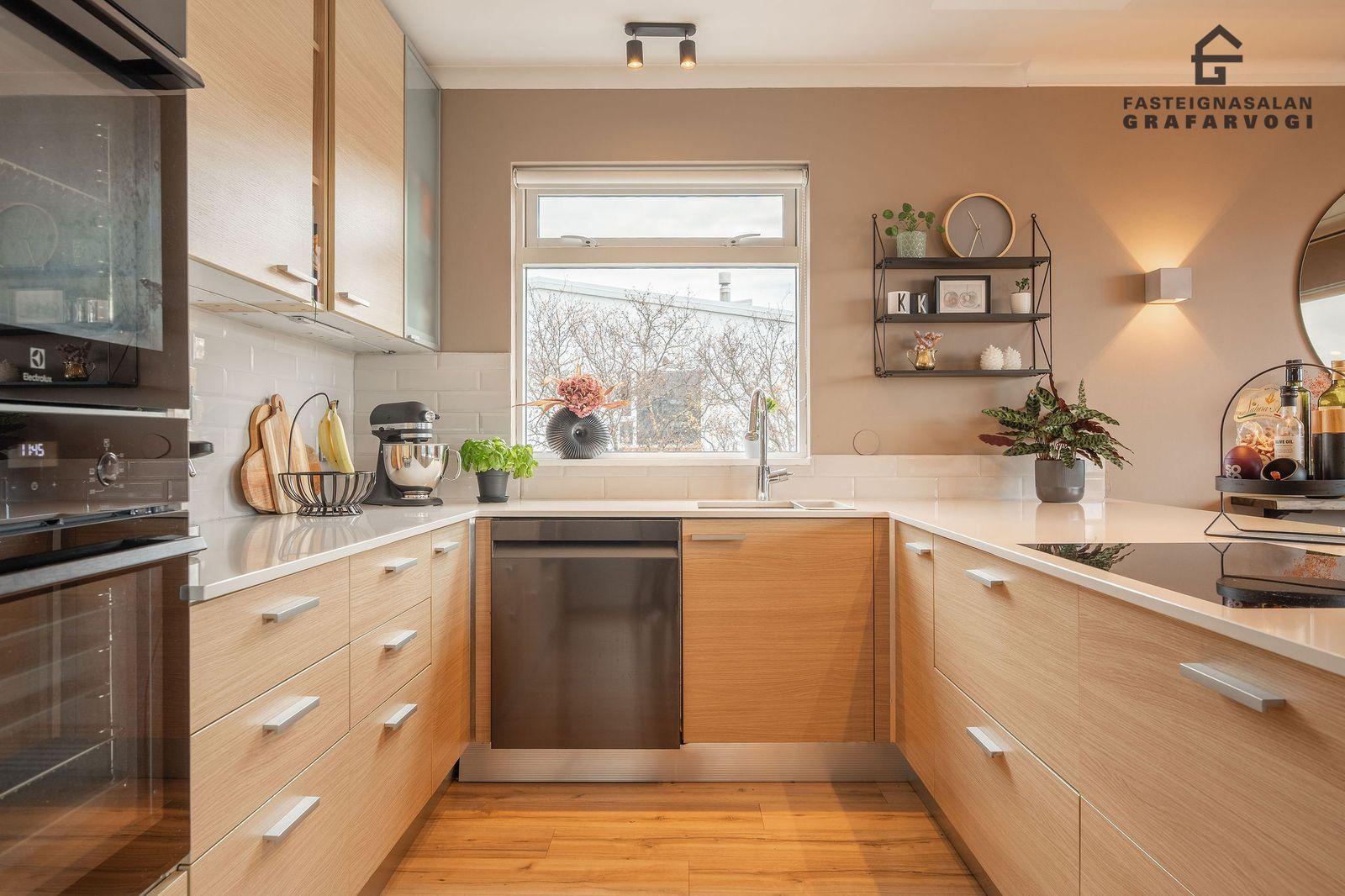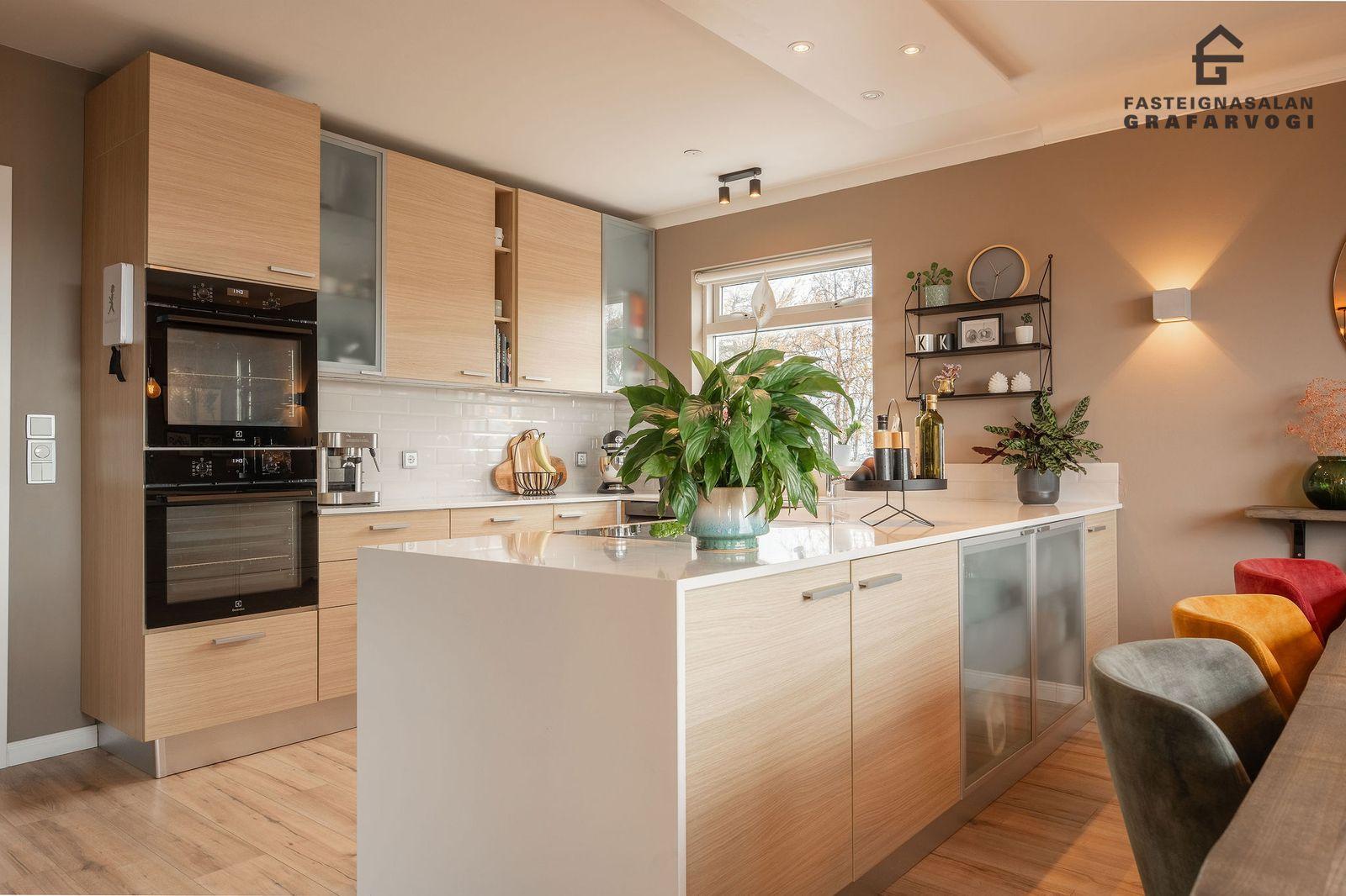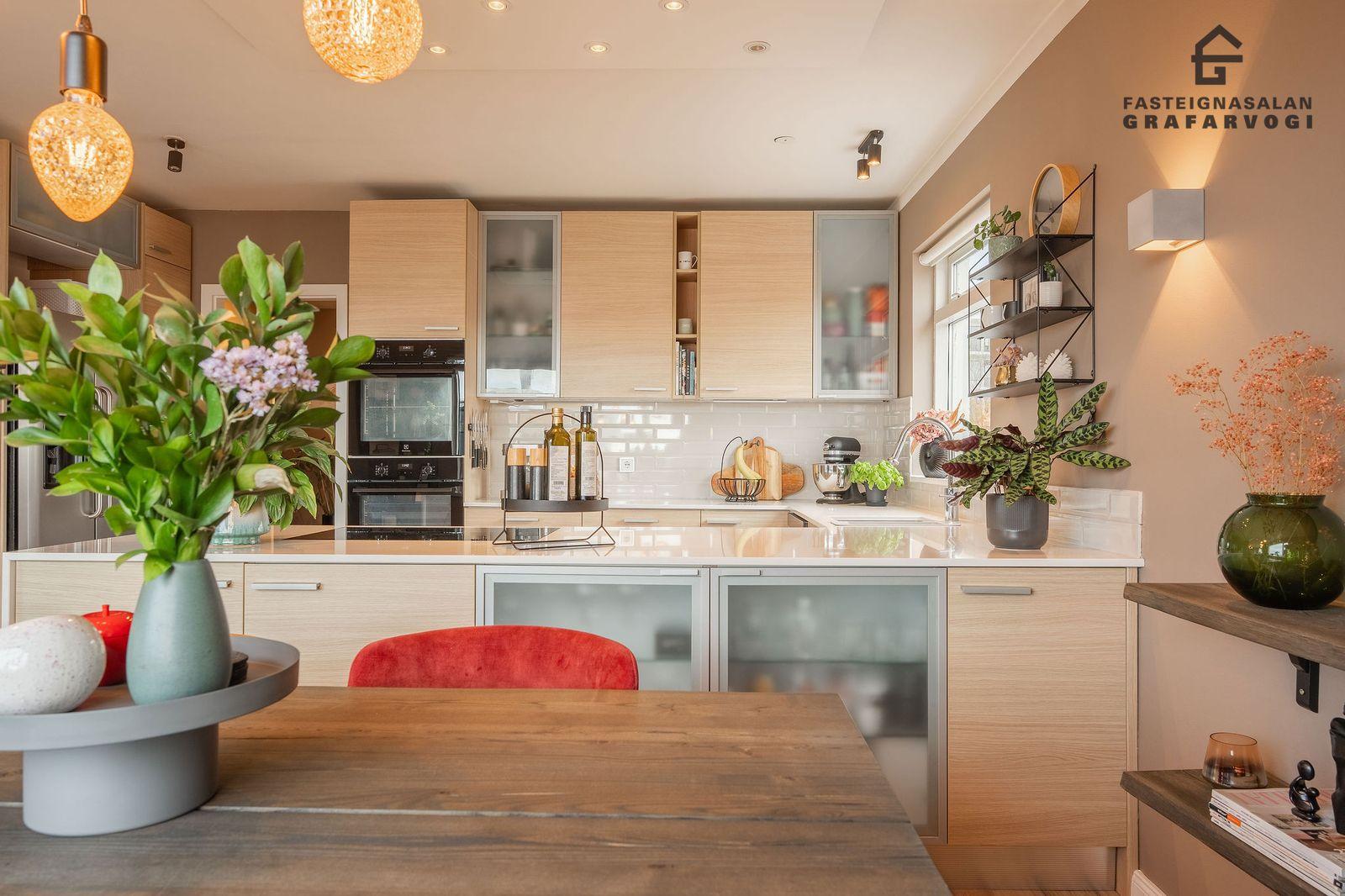 Eldhús: Er með fallegri innréttingu með hvítum subway flísum á milli skápa og hvítri Corian borðplötu. Tveir nýlegir ofnar í vinnuhæð og tengi fyrir uppþvottavél og tvöfaldan ísskáp. Parket á gólfi.