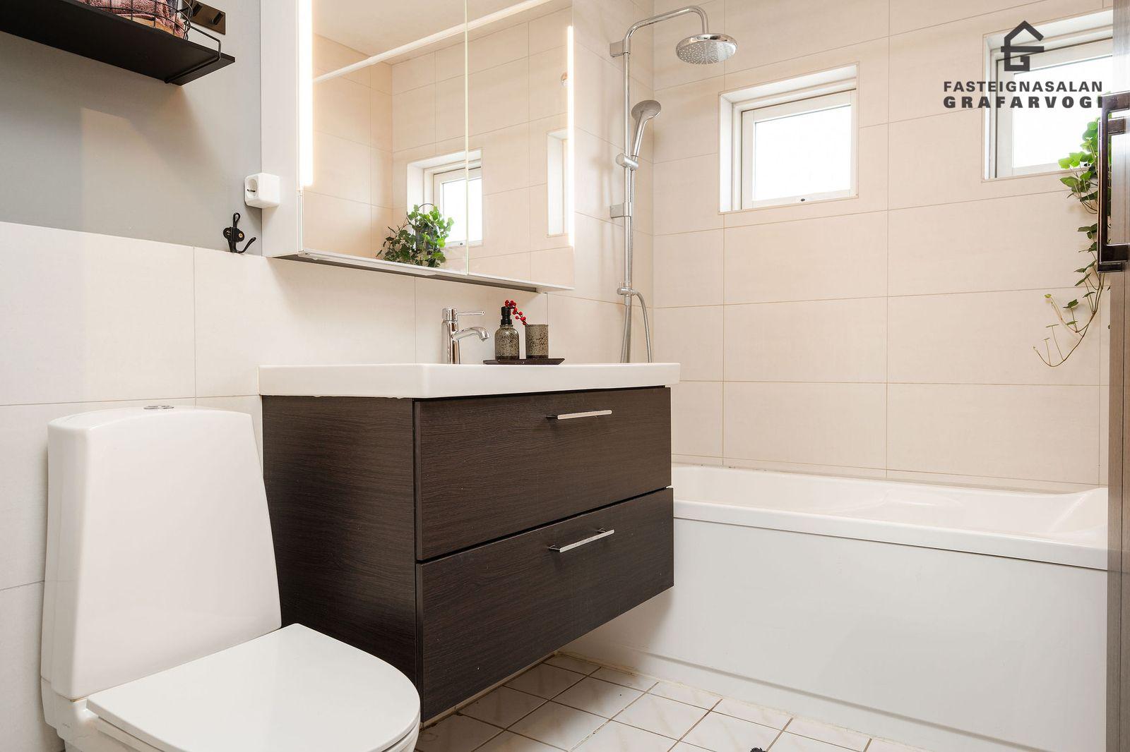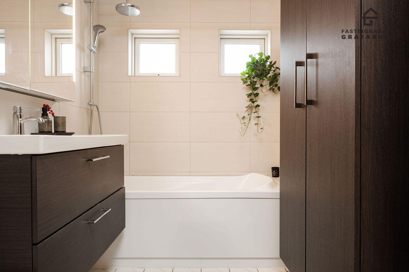 Baðherbergi: Flísalagt í hólf og gólf. Baðkar með sturtu. Góð innrétting með speglaskáp og handlaug ásamt rúmgóðum veggskáp og handklæðaofni.