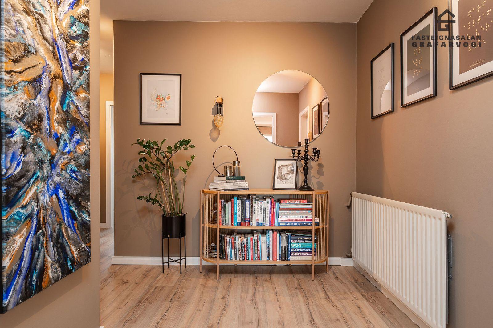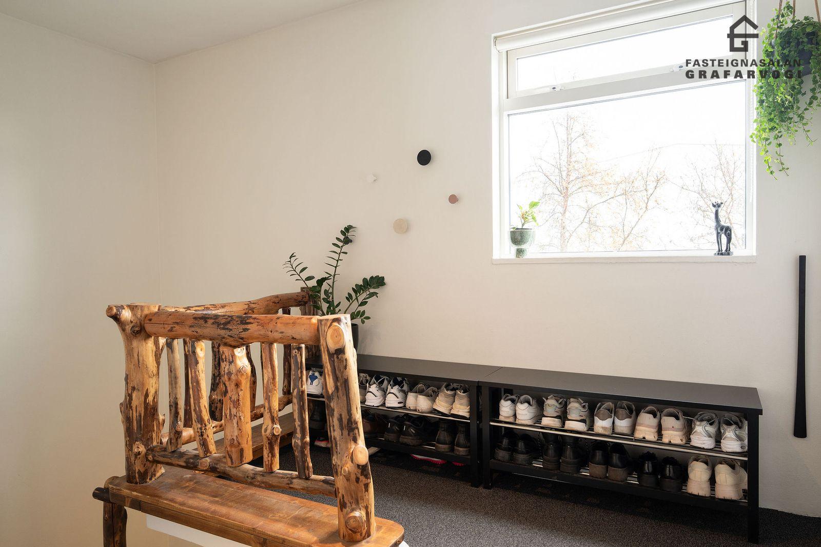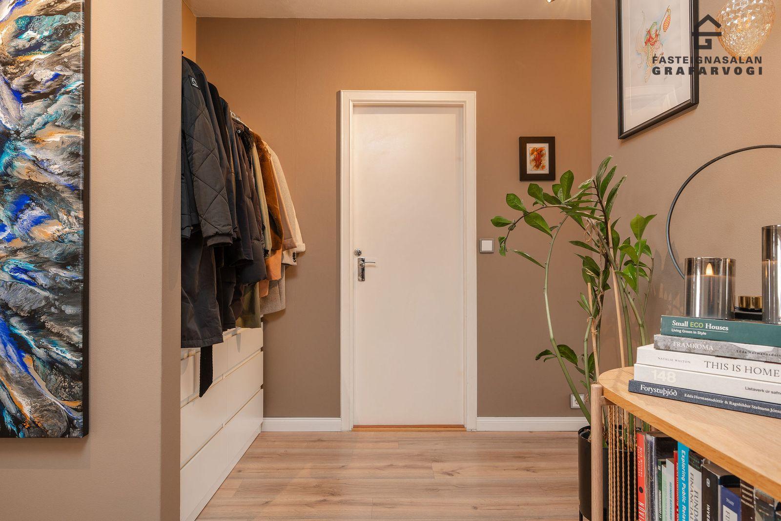 Nánari lýsing á íbúð:Anddyri: Gengið er inn um sérinngang upp snyrtilegan teppalagðan stiga. Fatahengi og skógrind er á stigapalli.
