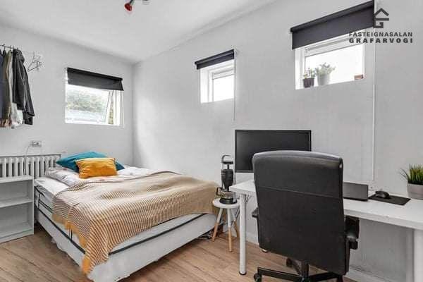 Herbergi í sameign: Í sameign er rúmgott og bjart herbergi sem tilheyrir íbúðinni, staðsett í kjallara, með sér baðherbergi og parket á gólfi.