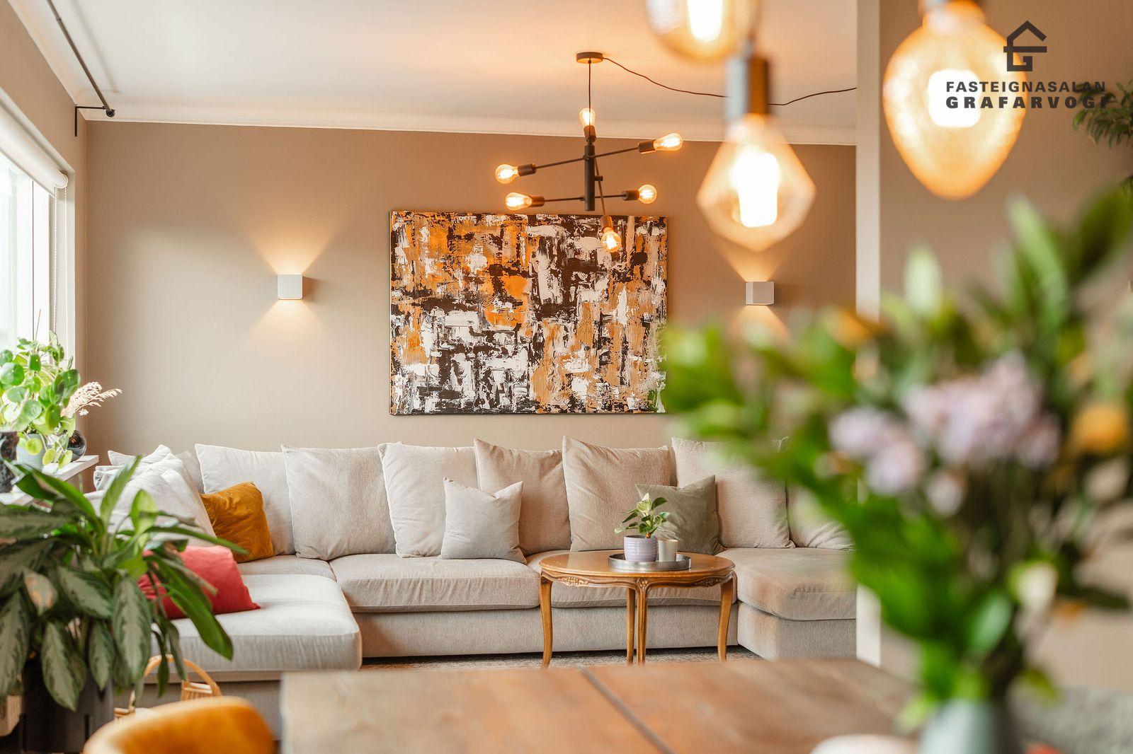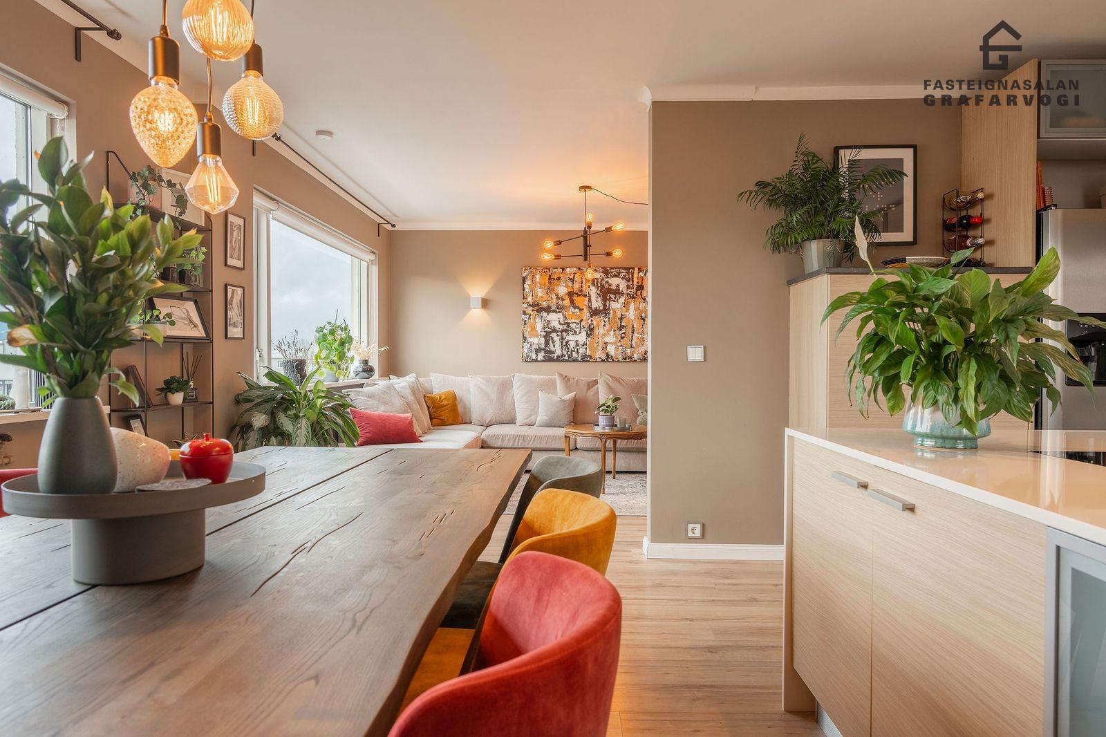 Stofa og borðstofa: Opið og bjart alrými með góðu flæði á milli eldhús, borðstofu og stofu. Nýlegt Birgison harðparket á gólfi. Úr stofunni er útgengt úr á stórar svalir sem ná yfir tvær hliðar hússins. Hluti þessara svala er yfirbyggður.