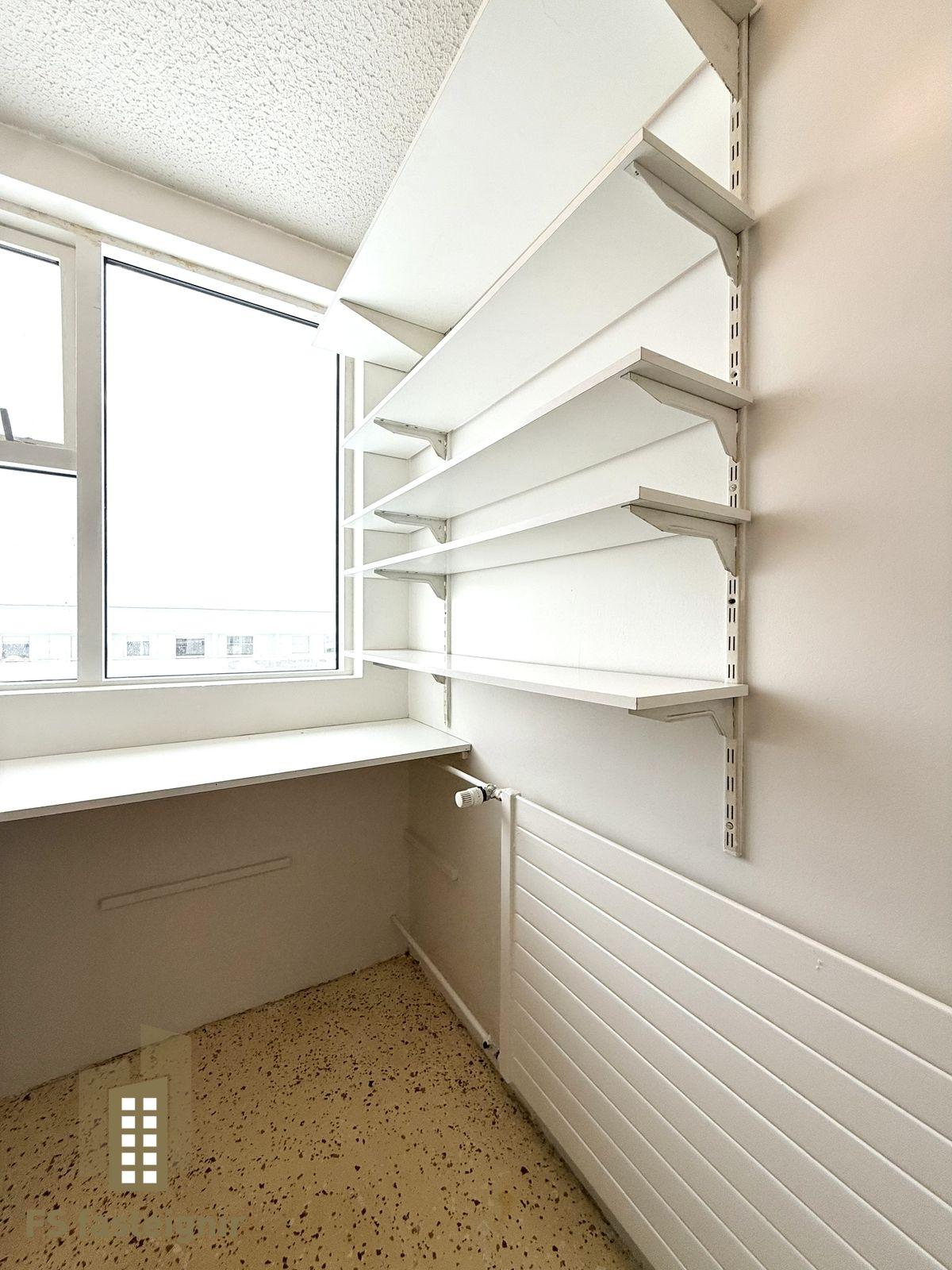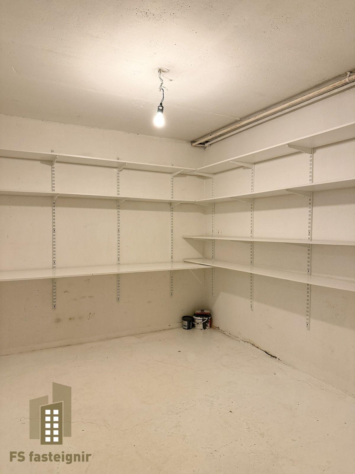 Sérgeymsla sem er mjög rúmgóð er í kjallara, málað gólf og hillur.