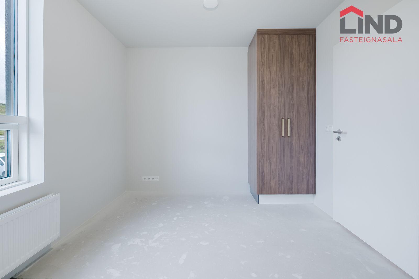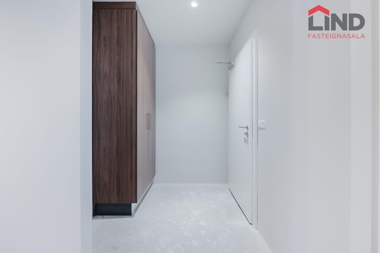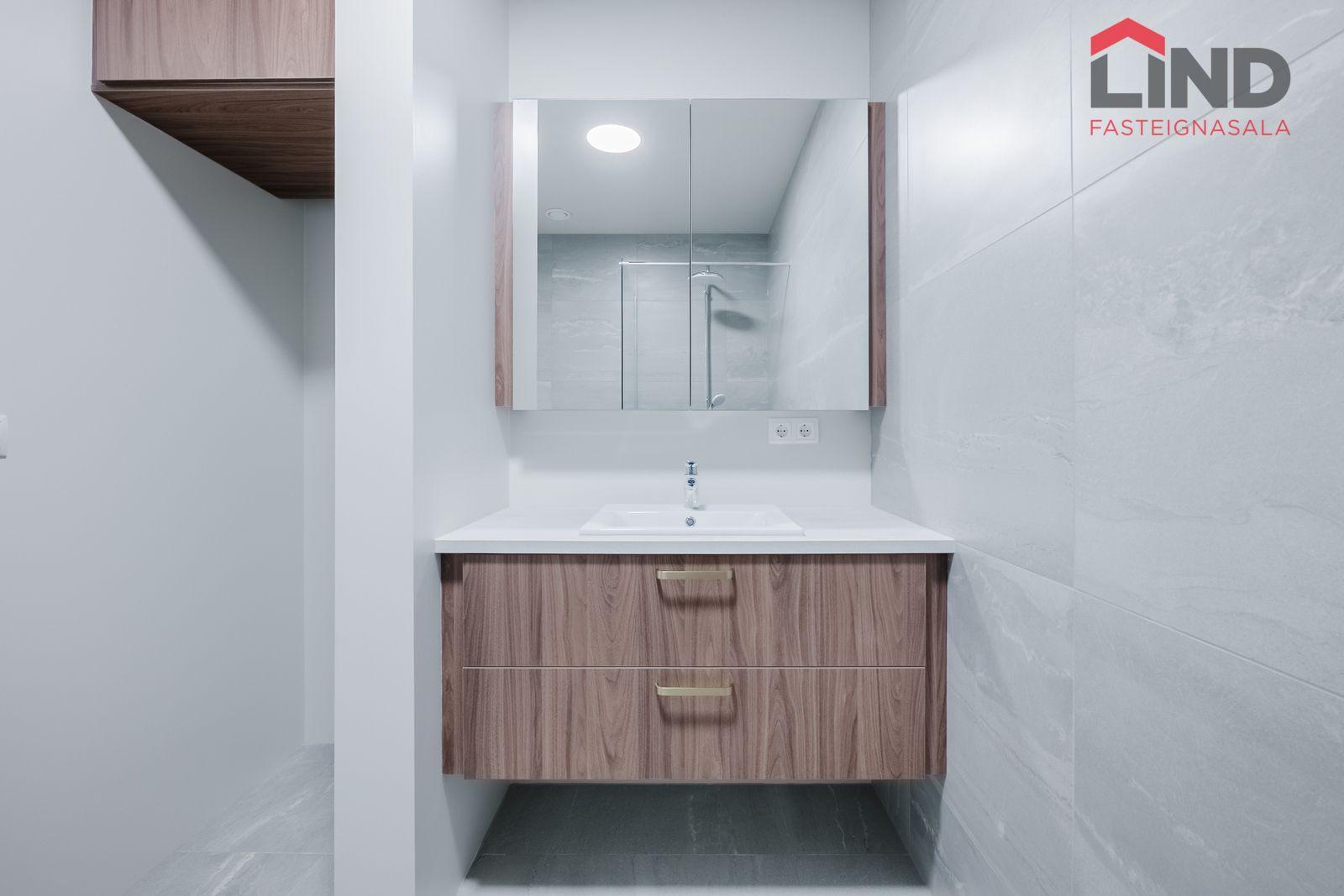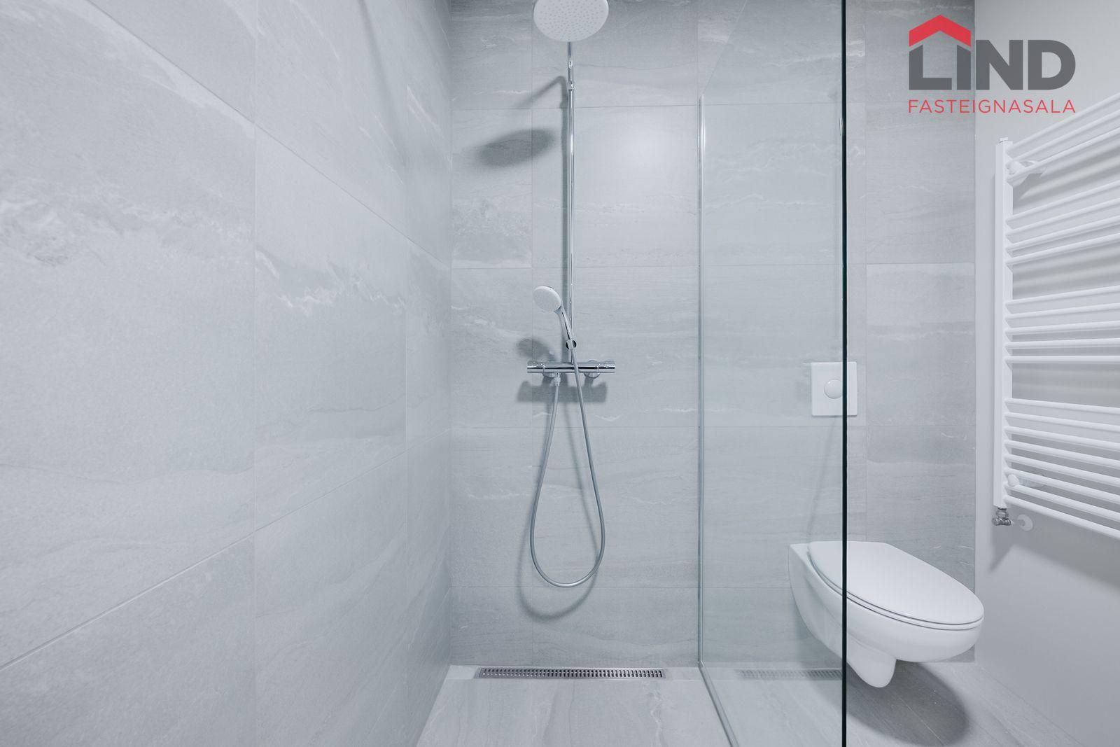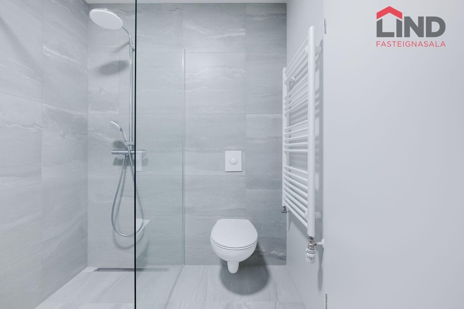 Baðherbergi: Baðinnrétting kemur frá Axis. Hreinlætistæki og handklæðaofn eru frá Byko. Salernið er upphengt og innbyggt. Hitastýrð blöndunartæki verða við sturtu. Gólf eru flísalögð og veggir að hluta upp í loft