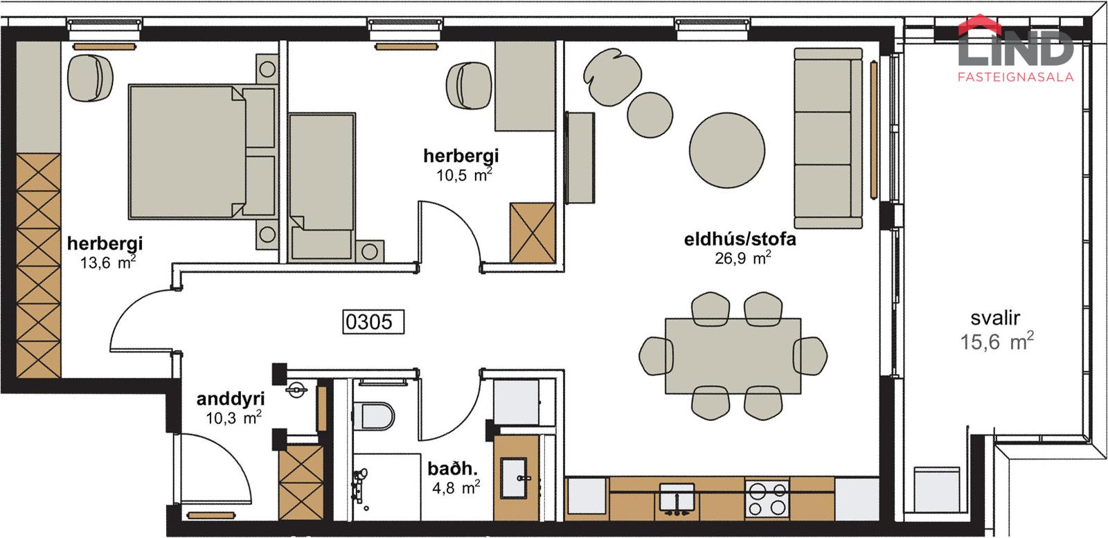 Íbúð 305: 81 fm 4ra herbergja íbúð á 3. hæð. Íbúðin er 81 fm þar af 3,9 fm geymsla