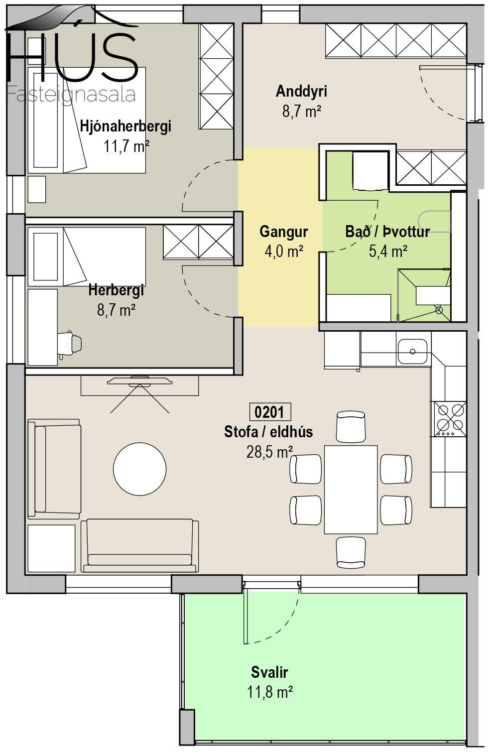 Íbúð 201- merkt efri hæð. Verð 54,9m