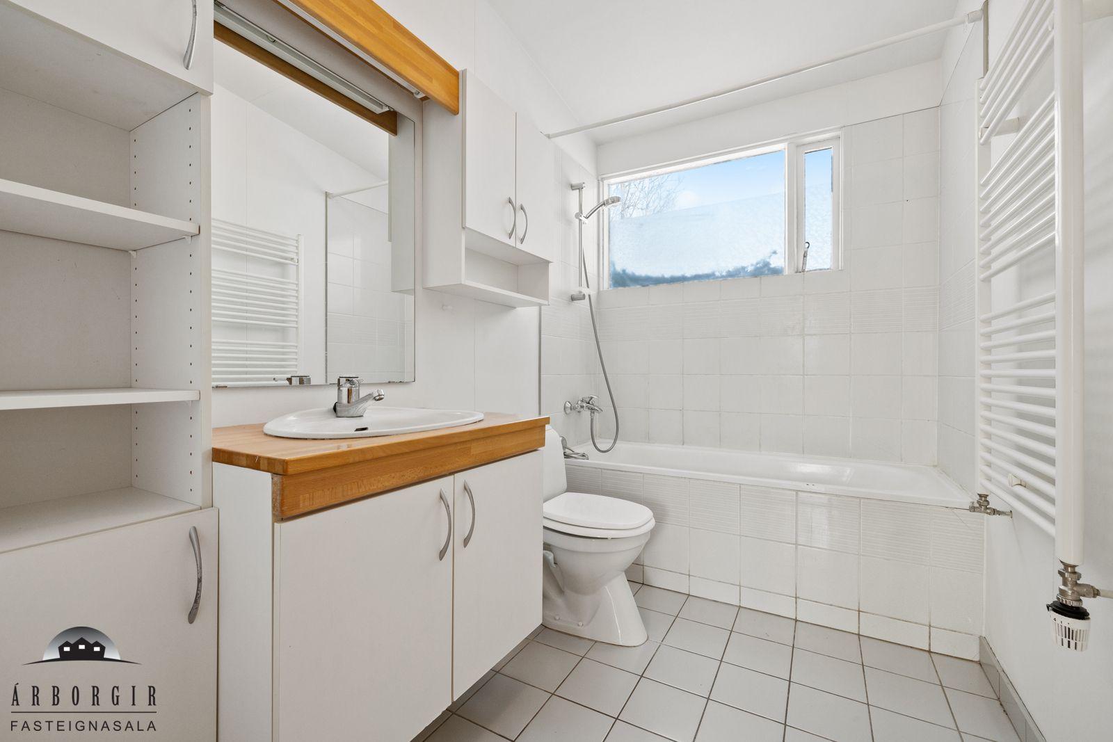 Baðherbergi er flísalagt og þar er baðkar og lítil innrétting.