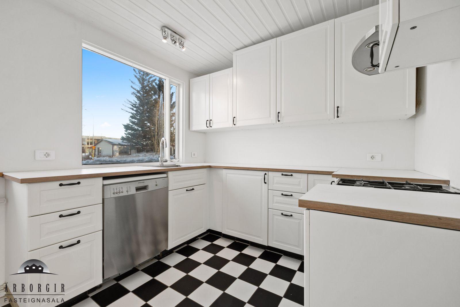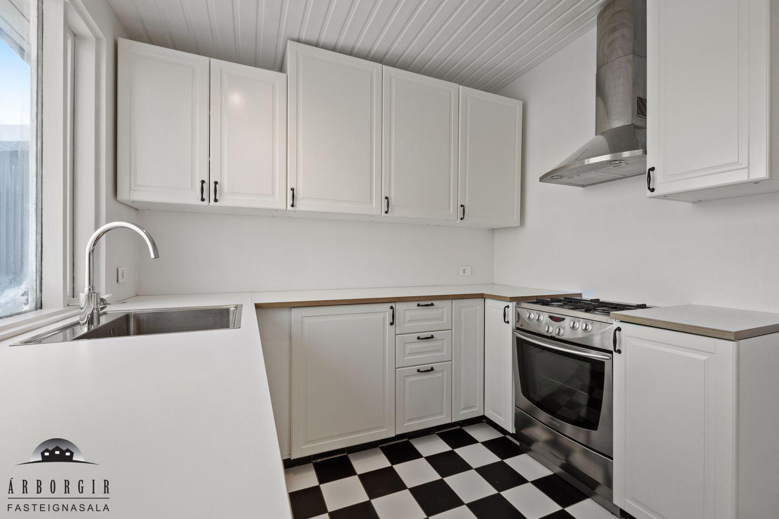 Eldhúsið er flísalagt og þar er snyrtileg innrétting.