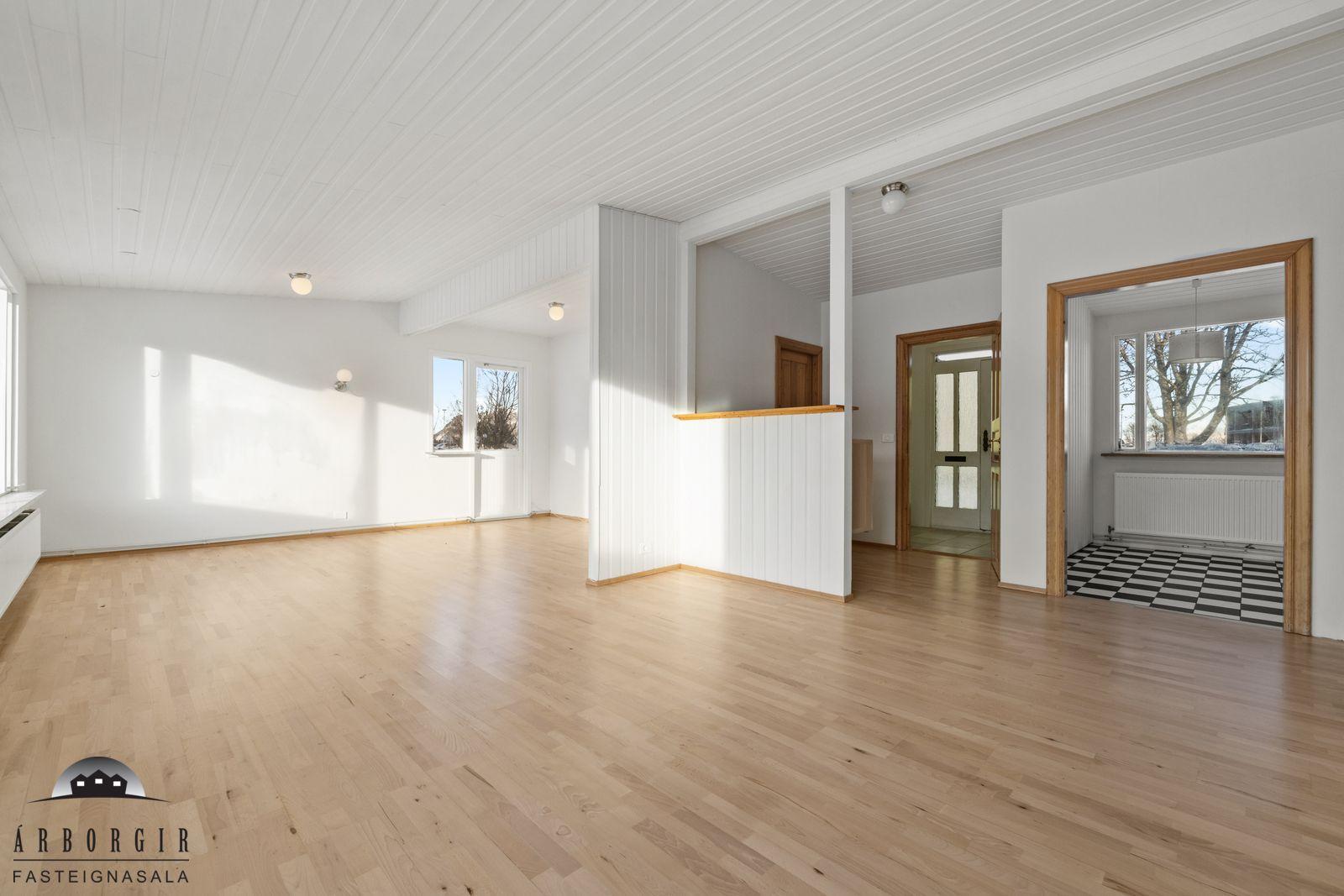 Heildarstærð hússins er 160,7m2 og er bílskúr 48,7m2 þar af. Fyrir um 11 árum síðan var húsið talsvert endurnýjað, pípulagnir yfirfarnar, rafmagnslagnir yfirfarnar au þess sem húsið var klætt að utan.