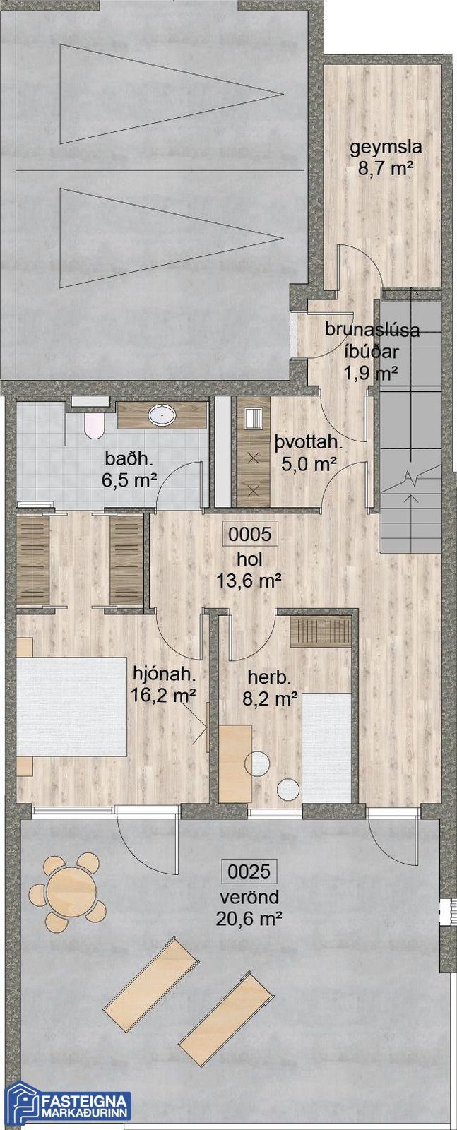Fasteignamarkaðurinn ehf. s: 570-4500 kynnir til sölu glæsilega 5 herbergja íbúð með sérinngangi í nýju tengihúsi í Fossvoginum. Íbúð 0105 er á tveimur hæðum bæði með svölum og verönd í glæsilegri álklæddri nýbyggingu á frábærum stað við Fossvogsveg við Fossvogsdal. Íbúðin er með stæði merkt B-08 í lokaðri bílageymslu. Fossvogsvegur 8-34 er nýtt 3ja hæða tengihús sem er í Fossvognum nánar tiltekið fyrir neðan Borgarspítalann á einstaklega veðursælum og fallegum stað.