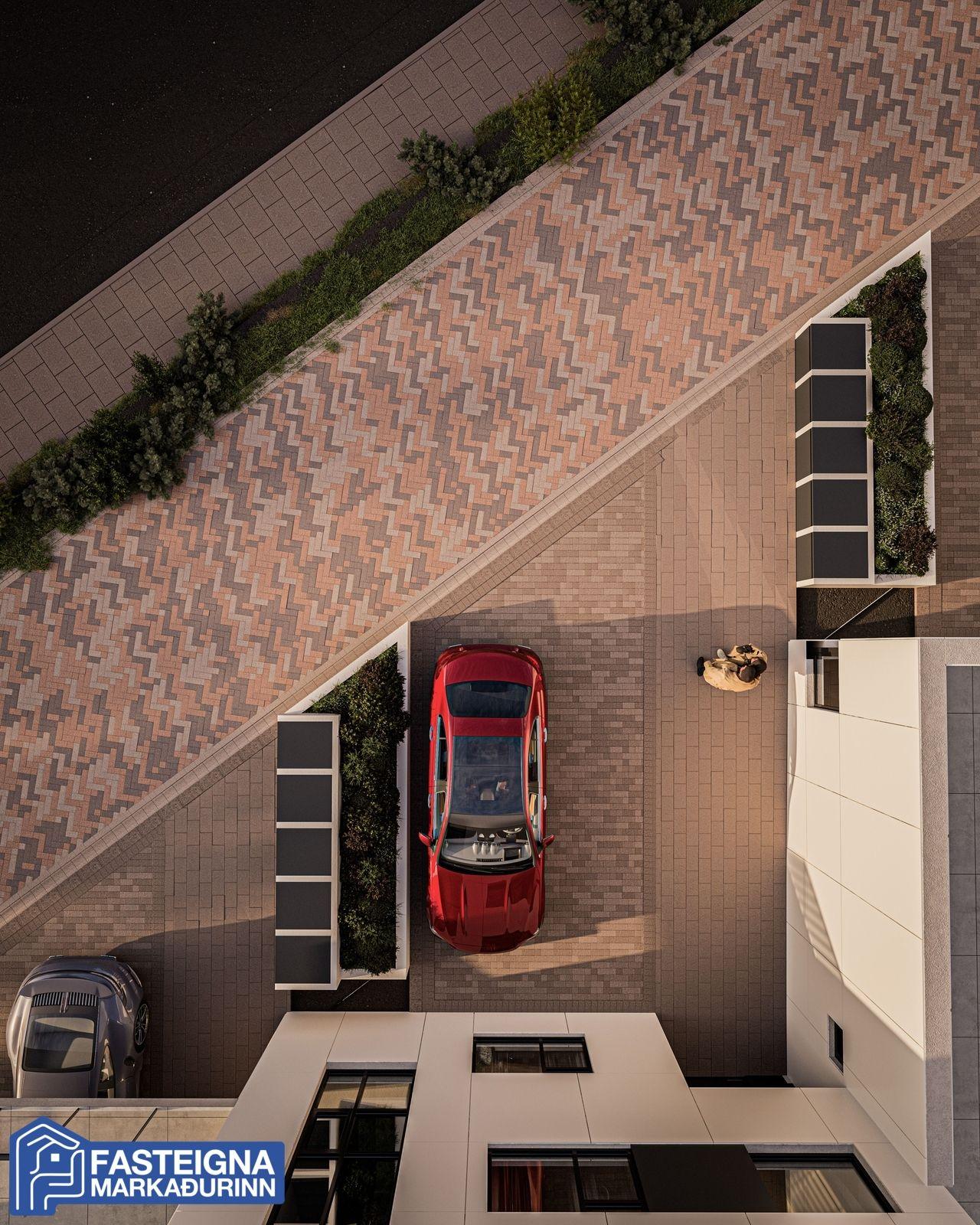 3.6. Lóð. Lóð verður fullfrágenginn samkvæmt leiðbeinandi teikningu landslagsarkitekts. Stéttar næst húsi verða hellulagðar og snjóbræðslulögn í stæðum framan við húsið samkvæmt teikningu. Bílastæði eru hellulögð þar sem við á. Akbrautir að húsinu sem og skábraut inn í bílgeymslu verða malbikaðar, steyptar og eða hellulagðar. Akbraut inn í bílgeymsluna verður með snjóbræðslu.