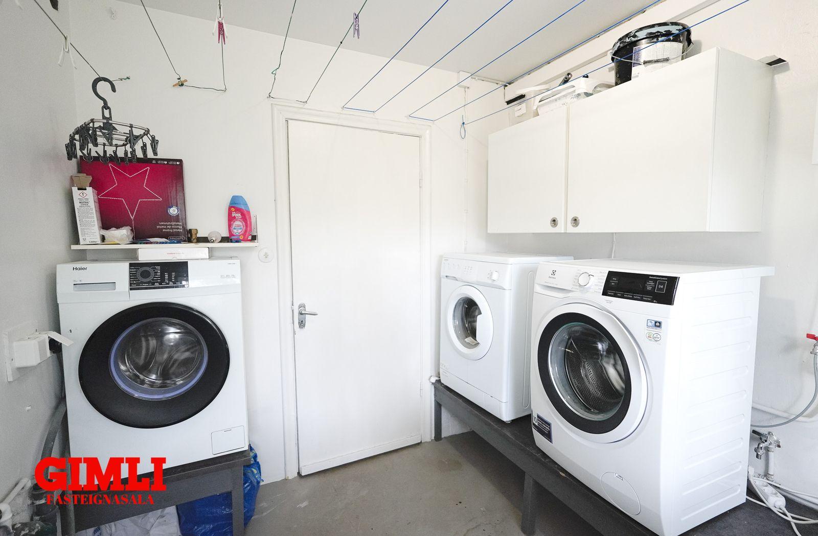 Sameiginlegt þvottahús í kjallara og köld sérgeymsla undir tröppum fylgir íbúðinni.